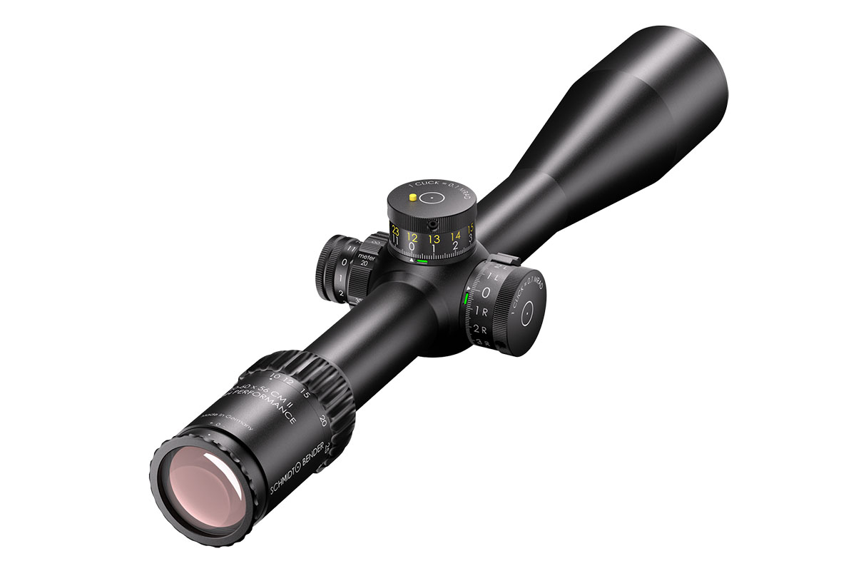 4060537066647 The 10–60×56 CM II High Performance (1.BE) is Schmidt and Bender’s flagship long‑range optic — engineered for extreme‑range competition, professional precision shooting and reconnaissance where uncompromising clarity, magnification and adjustment range are mandatory. Combining a massive 10–60× zoom with a large 56 mm objective, this scope delivers exceptional image resolution and brightness at extreme distances while retaining practical ergonomics for field use. Advanced optical coatings and a refined optical path yield light transmission well above 90%, producing high contrast and excellent target detail even at very high magnifications. The reticle in the first focal plane (FFP) ensures hold‑offs and subtensions remain accurate across the entire magnification range, making the scope ideal for real ranging and ballistic corrections on the fly. Mechanically the CM II High Performance is built around a 34 mm main tube with huge internal adjustment capacity. The elevation envelope exceeds 23 mrad (≈79 MOA) to cover extreme ballistic needs, and ultra‑fine turret options (as low as 0.1 mrad click value) allow precise, repeatable adjustments. The housing is engineered to operate in harsh environments and wide temperature ranges while maintaining mechanical integrity and point‑of‑impact reliability. Key Specifications Magnification: 10–60× Objective Lens Diameter: 56 mm Main Tube Diameter: 34 mm Elevation Adjustment Range: > 23 mrad (approx. 79 MOA) Typical Click Value: 0.1 mrad (configuration‑dependent) Eye Relief: ~90 mm Exit Pupil: approx. 5.6 mm → 1.0 mm across the zoom range Weight: ~940–999 g (configuration dependent) Length: ~442 mm Optical Transmission: > 90 % Reticle: First Focal Plane (FFP) Durability: Weatherproof, fogproof and built for professional field use