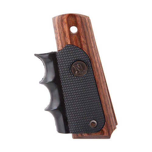SPECS: Smooth rosewood laminate, with black molded neoprene rubber. Fits 1911 Auto Gov't. and Commander pistols. No relief cut for Ambidextrous Safeties.