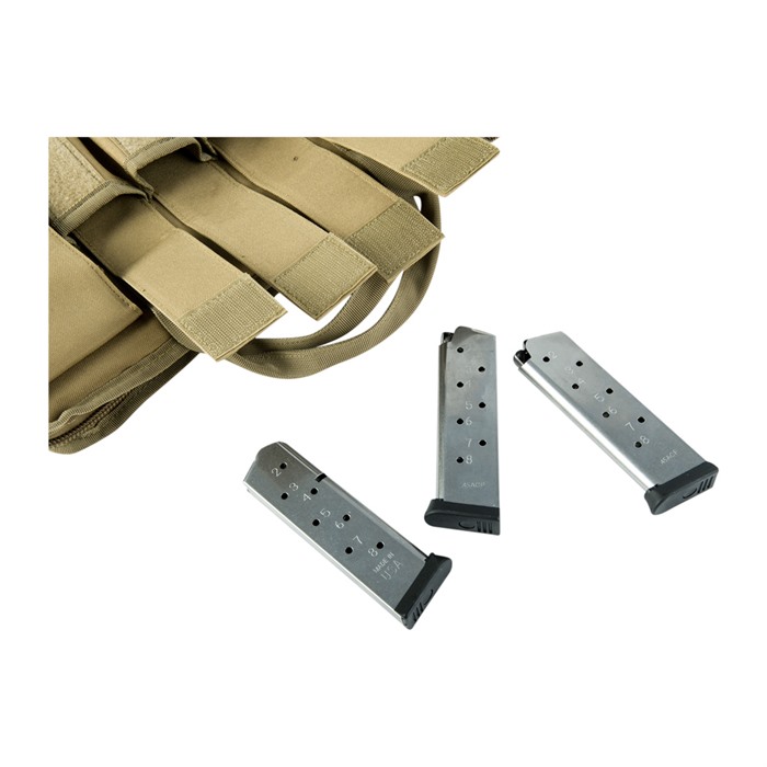 The perfect range bag for the 1911 fan! Our heavy-duty, soft-sided bag has plenty of padding to protect your 1911 from damage during transport to and from the range. Inside are attachment points to secure your pistol, as well as a magazine pouch and a general use pocket, both with flap covers. Four pistol magazine pouches on the exterior, plus two zippered pockets with hook-and-loop closure flaps. Wraparound nylon web handles give solid support during carry. As if that's not enough, here's a bonus: you also get 3 (three!) high-quality Metalform SS-MAG 8-round 1911 magazines in .45 ACP.