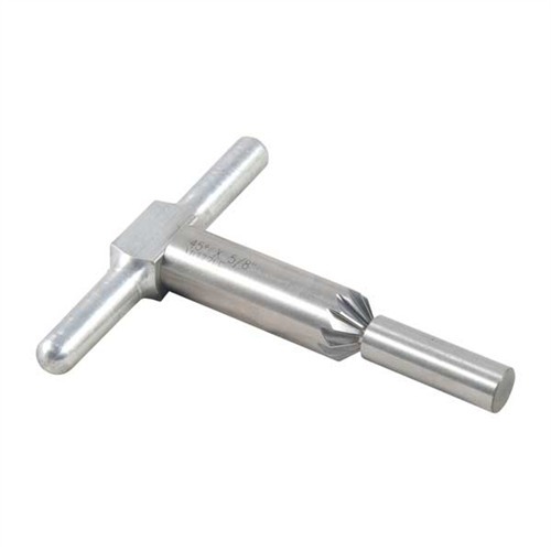 Il cutter di smussatura a 45° rompe i bordi delle righe per un'uscita pulita del proiettile o smussa le bocche delle camere dei cilindri delle revolver per ricariche rapide. Include il cutter, un manico e un pilota, il tutto in una scatola di polipropilene. Il pilota intercambiabile mantiene il cutter correttamente allineato. Acquista piloti extra per utilizzare un cutter con diversi calibri. I piloti per altri calibri sono disponibili separatamente. Il cutter a 45° fornito nei set contrassegnati con un * ha un diametro di 5/8" per smussare correttamente le bocche dei maggiori barili e cilindri di quei calibri. Tutti gli altri set hanno un cutter a 45° con un diametro di ½".