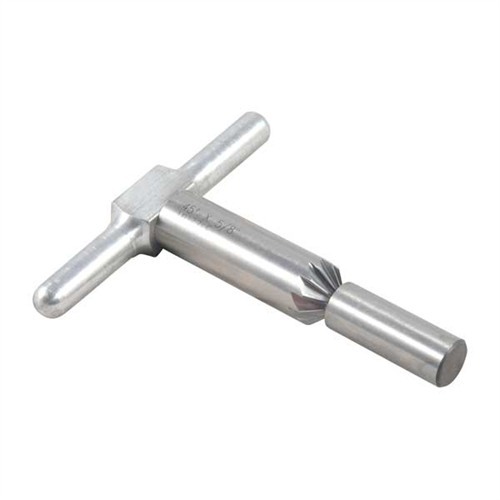 Il cutter per sbavare a 45° rompe i bordi delle righe per un'uscita pulita del proiettile o sbava le bocche delle camere del cilindro dei revolver per ricariche rapide. Include il cutter, un manico e un pilota, tutto in una scatola in polipropilene. Il pilota intercambiabile mantiene il cutter correttamente allineato. Acquista piloti extra per utilizzare un cutter per molti calibri diversi. Piloti per altri calibri disponibili separatamente. Il cutter a 45° fornito nei set contrassegnati con un * ha un diametro di 5/8" per sbavare correttamente le bocche dei cilindri e delle canne più grandi su quei calibri. Tutti gli altri set hanno un cutter a 45° con un diametro di ½".
