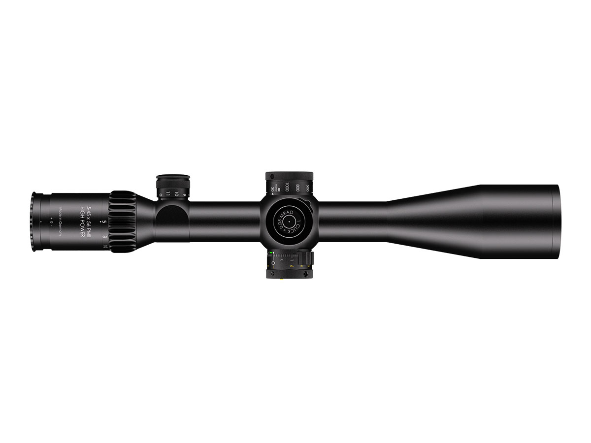 4060537027488 The 5–45×56 PM II High Power is a professional‑grade precision optic that merges a high‑performance riflescope with spotting‑scope capability. Designed for observation and ultra‑long‑range engagement, its enormous 9× zoom range (5–45×) makes it equally at home on reconnaissance, match, or tactical platforms where both identification and shot‑making accuracy are required. Engineered for extreme clarity and reach, the 56 mm objective delivers excellent light gathering while the optical system maintains a large usable field of view across the entire zoom range — allowing fast situational awareness at low magnification and razor‑sharp detail at high power. The reticle sits in the first focal plane, so hold‑offs and subtensions remain precise at any magnification. The model features robust, lockable turrets with fine 0.1 mrad click values and very large usable internal adjustment ranges tailored for extreme‑range correction. Built on a rugged 34 mm main tube, the High Power is constructed for demanding environments: it is fully weatherproof, fogproof and shock‑resistant. Despite its long reach, the design balances mechanical strength with practical ergonomics for field use. Standout Features Exceptional 5–45× magnification range for combined observation and precision shooting Large 56 mm objective for outstanding light transmission and image resolution First focal plane reticle for accurate ranging and holdover at any magnification Precision turrets with 0.1 mrad click value and extensive elevation/windage adjustment range Side/parallax adjustment for crisp focus from mid‑range to extreme distances High optical transmission (~90%) and illuminated reticle options for low‑light operations Robust 34 mm tube, weatherproof and built for professional use Key Specifications Magnification: 5–45× Objective diameter: 56 mm Main tube diameter: 34 mm Field of view: approx. 7.8–0.9 m @ 100 m Exit pupil: approx. 8.8–1.2 mm Eye relief: 90 mm Length: approx. 434 mm Weight: approx. 1,130 g Reticle: FFP (various tactical reticle options) Click value: 0.1 mrad Elevation adjustment range: ~27 mrad (internal ~29.6 mrad) Windage adjustment range: ±6 mrad (internal ~21.1 mrad) Parallax: adjustable Illumination levels: multiple (illuminated reticle available) Optical transmission: ~90% Designed and manufactured to professional standards, the 5–45×56 PM II High Power is the go‑to optic for operators and precision shooters who require unmatched versatility, extreme reach and uncompromising optical and mechanical performance.