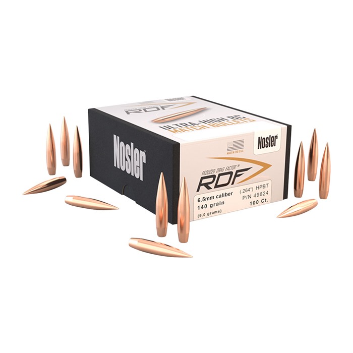 NOSLER REDUCED DRAG FACTOR (RDF) 6.5MM (0.264") HOLLOW POINT BOAT TAIL RIFLE BULLETS Creating the flattest trajectory and least wind drift possible is Nosler’s RDF bullet which was designed from the ground up to provide exceptionally high ballistic coefficients. The key attributes to the RDF’s outstanding performance are Nosler’s meticulously optimized compound ogive and long, drag reducing boat-tail, which make hand loading a snap and create an incredibly sleek form factor. RDF bullets also feature the smallest, most consistent meplats of any hollow point match bullet line, saving you time from having to point or trim tips. FEATURES: Hollow Point Boat Tail. Compound Ogive is insensitive to seating depth. Very small meplat. Ultra-High BC for flatter trajectory and reduced wind drift.