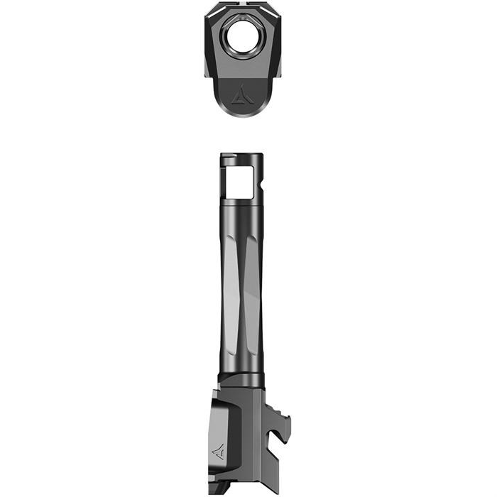 AFTERBURNER + RAMJET FOR GLOCK 43 The Radian® AFTERBURNER™ + RAMJET™ combo provide unprecedented recoil reduction and match grade accuracy in a concealed carry package. The threadless barrel design allows for effortless install/removal for cleaning, while LEGAL FOR SALE IN ALL 50 STATES*. The AFTERBURNER™ compensator is machined from hardened stainless steel and the RAMJET™ barrel from hardened 416R SS; both are enhanced with a Radianite™ coating. This combination achieves low friction, high hardness, and high corrosion resistance, making overall durability and erosion from muzzle blast a non-issue. Angled front faces on the AFTERBURNER aid in holstering. The INTRA-LOK® mounting system uses the taper lock principle; a tapered locking screw interfaces with an angled V-groove on the underside of the barrel. This perfectly times the compensator as it locks down onto the upper barrel profile on the muzzle end of the barrel. INTRA-LOK® allows the user to simply slide the compensator over the barrel, insert and tighten the locking screw, making for a simple and repeatable installation process. This system allows the user to easily remove the barrel from the slide for cleaning. DISCLAIMER: “GLOCK” is a federally registered trademark of GLOCK, Inc. and is one of many trademarks owned by GLOCK, Inc. or GLOCK Ges.m.b.H. Neither Brownells nor this site are affiliated in any manner with, or otherwise endorsed by, GLOCK, Inc. or GLOCK Ges.m.b.H. The use of “GLOCK” on this page is merely to advertise the sale of GLOCK pistols, parts, or components. For genuine GLOCK, Inc. and GLOCK Ges.m.b.H. products and parts visit www.glock.com.