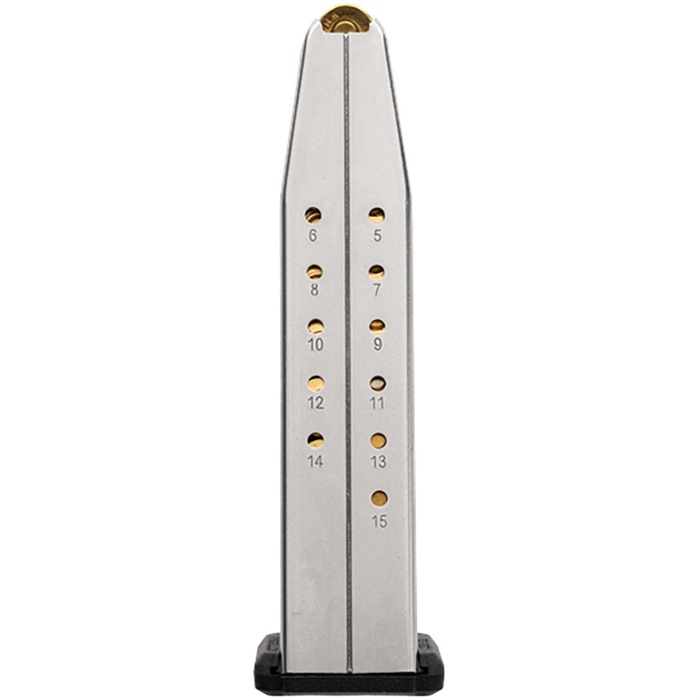 Il caricatore AMAG 15 SG9 include molte delle innovazioni nel design dei caricatori, come un follower a inclinazione controllata per un'alimentazione precisa e una molla in acciaio inossidabile che mantiene la tensione necessaria per un caricamento e un fuoco ripetuti. La piastra di fondo robusta e flare è facilmente rimovibile per la pulizia e la manutenzione di routine.