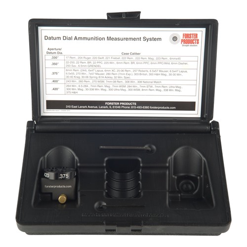 Il Datum Dial viene fornito con una custodia. Il kit include: Case Dial, Bullet/Cartridge Dial #1, Bullet/Cartridge Dial #2 e Storage Box. Dial #1 per diametri di proiettile .224, .243, .264, .284, .308. Dial #2 per diametri di proiettile .17, .204, .257, .338.