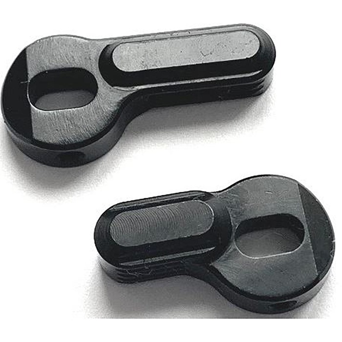 ASF-50Q is a short throw (rotate to 50 degree for FIRE/SEMI) semi auto selector with q (offset) levers. ASF (Ambidextrous Selector, Forward Controls) and SOLGW’s "The Quick" is a joint project between FCD and SOLGW. ASF was designed from the ground up to be a defense/duty/combat safety selector, its mission is quite aptly reflected by the way its levers are attached the center, via a stainless steel roll pin. The lever to center interface is immensely strong, the high shear strength (800 lbs) 420 stainless steel spring steel roll pin simply holds the two in place, and doesn't handle any load. One of the design goals dictates there be no wobble between the lever and center, Forward Controls Design called for very tight tolerances (+0.001/-0.00) on ASF's lever and center interface to achieve that. Q levers are offset levers, by shifting the lever closer to the shooter's thumb when the selector is on SEMI/FIRE, it enables the user to more easily rotate it back to SAFE without shifting his grip. For that reason, q levers are side specific, the q lever's "leg" should always be biased towards the top. With the selector on SEMI/FIRE, the q lever should look like a letter q (hence its name). Forward Controls Design are known to many for the dimpled pattern they use on some control surfaces (AA, or All Angles, is the designation). ASF levers are serrated, not dimpled. As the lever rotates, the user’s finger slides on the lever, anything but serrations along the length of the lever only impedes that movement and creates friction for no benefit. Serrations diagonal or perpendicular to the length of the lever are similarly unhelpful. Serrations parallel to the lever's length help mitigate lateral movement, and do not impede the finger's sliding motion. ASF lever's profile isn't square, its outer most portion is somewhat tapered for a reason. When the user’s hand holds the pistol grip, the profile of the ASF lever conforms to angle of the thumb's pad. For friends and customers that wish to see dimples on the ASF, there is a single dimple on both sides to function as a position indicator (in lieu of a pointer), it’s elegant and simple. ASF is shipped with a selector spring, a KNS nitrided selector detent, two levers (or one lever, with an end cap), 4 roll pins (two for installation with 2 spares). ASF centers are billet machined in 8620, heat treated and black nitrided. Levers are billet machined in 8620 and black nitrided. ASF is a collaboration with Sons of Liberty Gunworks. Made in the USA.