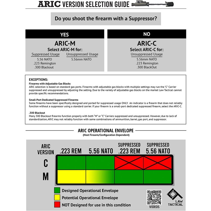 LAW TACTICAL LLC ARIC INTERNAL CARRIERS FOR AR-15 FIRE FOLDED! The Law Tactical ARIC (AR Internal Carrier) is a drop in conversion for AR15-type direct impingement firearms that replaces the traditional Bolt Carrier Group, Recoil Spring and Buffer. Firearms equipped with ARIC and Law Tactical Folding Stock Adapters can be fired repeatedly in both the folded and unfolded position, expanding the mission profile of the AR15. NO TOOLS REQUIRED! Once installed, ARIC does not require any tools for removal, reinstallation, cleaning, maintenance or conversion. Each component can be field stripped, inspected or replaced without tools. Maintaining the simplicity and efficiency of the AR system. 100% BACKWARD COMPATIBILITY! ARs can be converted between ARIC and standard BCGs and recoil components without tools, maintaining compatibility with standard AR15 components, enhancing the ARs capabilities while maintaining interoperability. THERE ARE TWO VERSIONS OF ARIC TO ACCOMMODATE VARIOUS SYSTEMS: ARIC-C: Unsuppressed Usage: 5.56mm NATO, .223 Remington. ARIC-M: Suppressed Usage : 5.56mm NATO, .223 Remington, Unsupressed Usage: 5.56 Nato. See ARIC Version Selection Guide for more information. For all technical questions please contact Law Tactical directly at: 267-209-0529, or sales@lawtactical.com.