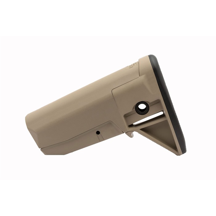 Weighing in just over 7 ounces, the BCMGUNFIGHTER™ Stock is one of the toughest and lightest polymer stocks for Mil-Spec receivers being made today. The Stock is designed slick, to prevent potential tangling with the end-user's sling, pouches, webbing or other gear and is designed with only five parts and one screw. Finally, each Stock is capped with an integrated, color matched rubber butt pad for secure placement in the shoulder pocket as well as increased overall durability. Featuring a new patent pending latch, the BCMGUNFIGHTER Stock reinvents the stock interface with a Mil-Spec buffer tube delivering both a precise engagement and a stock specifically engineered to dissipate impact stress through the assembly. The precision fit latch, made from heat-treated ordnance grade steel, is flat on all sides to ensure the Stock interface with the receiver extension cannot be obstructed by dirt or debris. Its unique geometry also provides increased torsional strength and eliminates the stress-riser found on conventional rounded pins. The Stock comes with both ambidextrous QD swivel sockets as well as a conventional sling attachment slot.