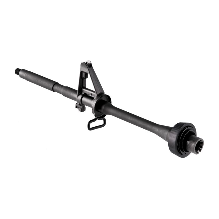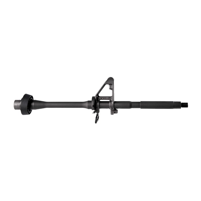 Brownells Government Barrel Assemblies – Chrome Lined and Individually Inspected The Brownells Government Barrel Assemblies are manufactured by a US Government Contractor for M4 barrels, and held to exacting standards. These barrels all feature a hard chrome bore, applied over button rifling. Each barrel is High Pressure Tested, followed by Magnetic Particle Inspection & Gauging to ensure there are absolutely zero imperfections. Assemblies are as ready-to-install as possible, with slip ring assembly, F-Marked front sight base and handguard cap pre-installed. Handguard caps are appropriate for the barrel length, with M4 Carbine assemblies featuring a round cap, and the rifle length featuring the proper triangle. Barrel material is 4150 chrome moly steel. 5.56x45mm chamber and 1-7 twist will ensure acceptance and desired performance with 62 grain and greater bullets. Barrels are all marked: “5.56x45mm NATO MFR 12238 MP HP 1-7”.