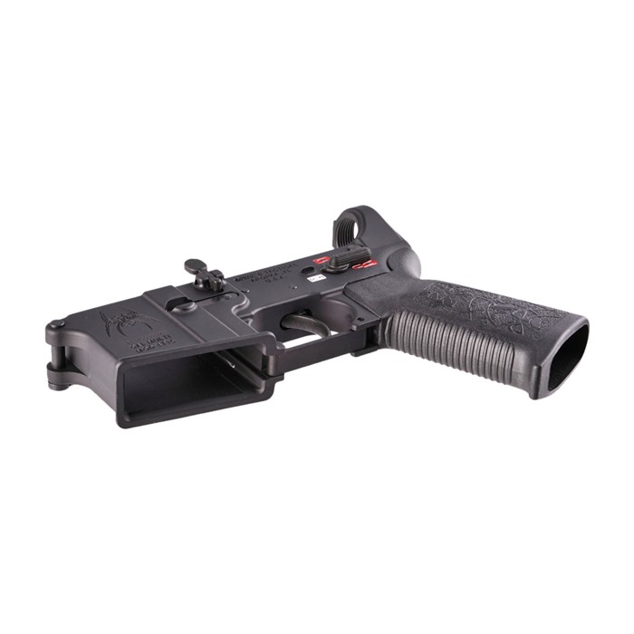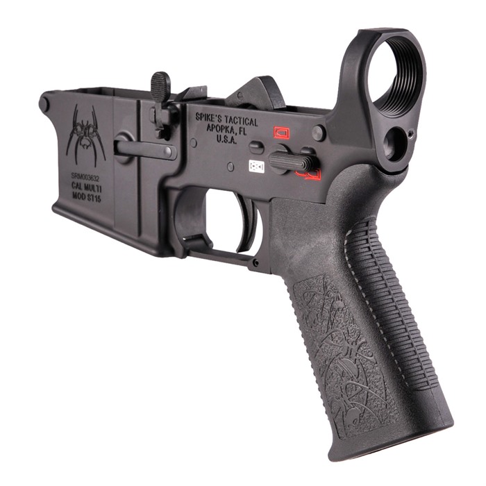 Il pozzetto del caricatore presenta il logo ragno di Spike's e la incisione multi-cal. Il Lower completo con buttstock include: