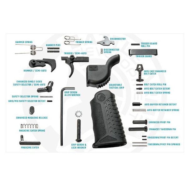 Battle Arms Development has put together an Enhanced Complete Lower Parts Kit! The Battle Arms Development Enhanced Complete Lower Parts Kit consists of Battle Arms high quality parts you already know and love, with the added bonus of several Investment Cast items, to ensure the most robust parts for your build. Enhanced Bolt Catch, which is a cost friendly alternative, without sacrificing the quality for your AR build! The AR-15 Cast Enhanced Bolt Catch is 8620 heat treated cast steel with a manganese phosphate black finish. With this upgrade you have a versatile modular design, enhanced control surfaces, lightweight engineering, and better ergonomics. Enhanced Single Sided Safety Selector for the AR15 Style Rifles- based on the famous BAD-ASS Ambidxtrous Safety Selector with distinctive and diagonal serrations Single Side Safety Selector (0°-90° SEMI AUTO) Fit all Mil-Spec Dimensioned AR-15 Lower Receiver Black Phosphate Finish Investment Cast 8620 Heat Treated Steel Enhanced Magazine Catch Process: Investment Cast (Same Process as Mil-Spec) Material: 8620 Heat Treated Steel Finish: Black Phosphate Finish Construction: One Piece Engineering (Not Two-Piece) Design: Lightweight Fluted Design Compatibility: Compatible with Mil-Spec Magazine Release Button, BAD-EMR, BAD-EMMR, etc. Length: Shorter Threaded Pin to Reduce Installed Magazine Button Profile of Solid Face Magazine Release Buttons Weight: 0.25 oz (v.s. 0.32 oz Mil-Spec) BAD-EMR (Enhanced Magazine Release) for the AR15/AR10. Precision CNC Machined for billet 7075-T6 Aluminum (not 6061) in an anodized BLACK finish, the BAD-EMR features an unique, fully solid "V" shaped button face with horizontal serrations (no thru hole). The concave V-Groove button face offers excellent ergonomic feel and self-centers the index finger as pressure is applied. The horizontal, parallel serrations helps slippage in the vertical orientation while minimizing drag in the horizontal direction for finger retraction. The BAD-EMR also features a lightweight skeletonize back to offset the weight gained from the fully solid button face and slightly increased height to equal the weight of the standard mil-spec magazine release (approxmiately 0.002 lbs). BAD-EMR is compatible with all lower receivers that accepts mil-spec magazine release buttons. BAD-ATG™ Adjustable Tactical Grip easily adjusts, with the included hex key, to each of the three most popular industry proven angles (17, 25, & 33 degrees) using the Patent Pending adjustable angle mechanism. The textured finger grooves and ribbed back-strap optimize comfort and provides positive control. Dimpled air gaps help keep hand dry while offering firm grip texture. Only 3.0oz complete with screw and washer! BAD-EPS Takedown and Pivot Pins: AR15 / M16 / M4 Compatible - Fits all AR15/M16/M4 lower receivers with mil-spec .250" diameter front pivot and rear takedown pin holes. Patent Pending Pivot Pin & Takedown Pin Head Designs - Greatly improved gripping surface and pull strength without the use of oversize heads. Low Profile Pin Heads - Low drag and never in the way. Lower profile than mil-spec pin heads. Ambidextrous Safety Compatible - The Enhanced Takedown Pin (BAD-ETP) head design does not obstruct the use of the right side ambi safety selector lever. Extended Pin Tips (+0.030" over milspec) - Added tip length noticeably aids in starting/pushing the pins out from the left side of the receiver, without undue protrusion. Each BAD-EPS comes with (1) BAD-ETP, (1) BAD-EPP, (2) KNS hardened stainless steel detents, (2) 17-7 nickel plated stainless steel pin springs, and (1) high-strength neodymium magnet for hassle free magnet assisted installation of the Enhanced Pivot Pin (BAD-EPP). Mil-Spec Trigger And Hammer Nickel Teflon Semi Auto Hammer and Trigger Disconnector Disconnector Spring Hammer Spring Trigger Spring Springs and Detents Qty 2 Takedown / Pivot Pin Springs Qty 2 Takedown / Pivot Pin Detents Qty 1 Bolt Catch Detent Qty 1 Bolt Catch Spring Qty 1 Trigger Guard Qty 1 Trigger Guard Roll Pin Qty 2 Hammer / Trigger Pins Mil Spec Qty 1 Safety Selector Detent Qty 1 Safety Selector Detent Spring Qty 1 Magazine Catch Spring Qty 1 Buffer Retainer Detent Qty 1 Buffer Retainer Detent Spring