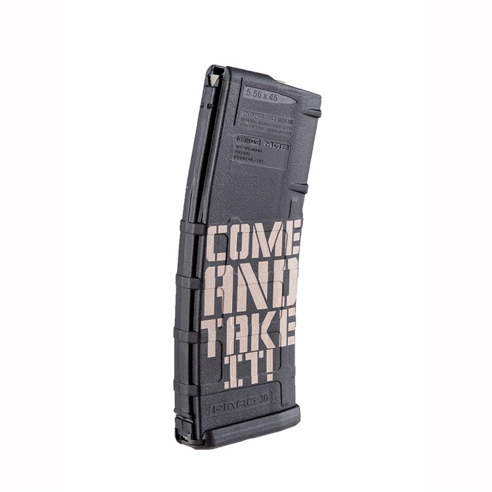 Exercise Both Your 1st & 2nd Amendment Rights With These Unique 30-Rd Mags Magazines are utilitarian devices - you need 'em so you can load rounds into your rifle or pistol and send them downrange, preferably in large numbers. Our AR-15 Specialty Magazines are a lot more fun than their name suggests. These are standard Magpul PMAG Gen M2 MOE 30-round mags with slightly edgy graphics permanently laser-engraved on them. Choose from the American classic ""Don't Tread"" entwined by a fierce-looking snake (a reference to the Revolutionary War Gadsden flag), the defiant ""COME AND TAKE IT!"" (used during both the Revolution and the Texas Revolution of 1836), and a simple, practical Fuel Gauge graphic on a PMAG Gen M3 Window mag. Because the designs are laser-engraved and not painted, they are highly resistant to wear and cleaning solvents. However you deploy these specialty mags, one thing is for sure: you can count on their steady, rock-solid, unfailing reliability because they're built by Magpul. We just added the whimsical graphics because.... why does your AR-15 magazine have to look just like every other AR-15 mag on the range?