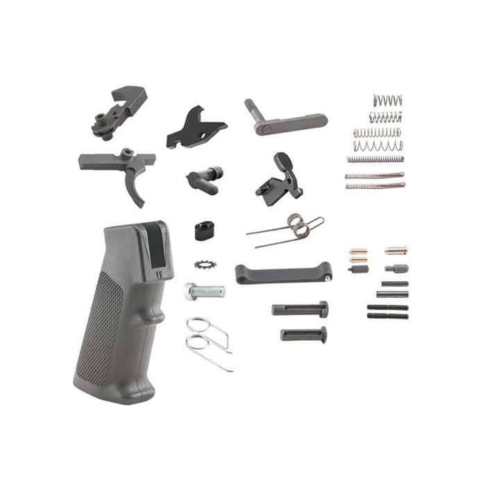 The LLRPK-1 AR-15 Lower Receiver Parts Kit from Luth-AR contains all the parts, down to the last spring and pin, to turn a stripped lower into a complete receiver ready for the buffer tube, buffer system and stock of your choice. Sure, we sell all of these parts separately, and Luth-AR has made a big name for itself in the last few years as a supplier of top-quality AR-15 accessories AND basic mil-spec parts. But why chase down all of these mil-spec commodity parts separately when this parts kit provide easy, "one and done" ordering? This parts kit includes complete, mil-spec AR-15 fire control components - trigger, hammer, disconnector, and all the pins-n-springs. Just note that it’s not a drop-in module, so you will have to assemble the parts. If you’ve done it before, no problem. If you haven’t, watch this video a few times before tackling it. Here are the complete contents of the LLRPK-1 lower receiver parts kit: Buffer Retainer & Buffer Retainer Spring Triggerguard & pin Safety selector lever + detent Selector/Ejector spring Bolt Catch + spring, plunger & roll pin Magazine catch Magazine release button (aluminum) Front pivot pin Rear takedown pin 2x Takedown/pivot pin detents 2x Detent springs Trigger Trigger spring Hammer, mil-spec w/J spring Hammer spring 2x hammer/trigger pin Disconnector Disconnector spring Mag Catch/Buttstock Plunger Spring 1-ea. A2 pistol grip (black plastic) Pistol grip bolt (slot-head) Pistol grip lock washer The Luth-AR folks also thoughtfully includes a standard A2-type plastic pistol grip that’ll get you up and shooting until you decide if you want a fancier, aftermarket grip. A lot of AR-15 shooters have spent their entire careers using the A2 grip, but if you want to upgrade, Brownells offers a LOT of options. Get the Luth-AR LLRPK-1 lower receiver parts kit, and you’ll be sure that when you sit down at your workbench to assemble your next AR-15, completion your project won’t be held up for lack of one or two small parts!
