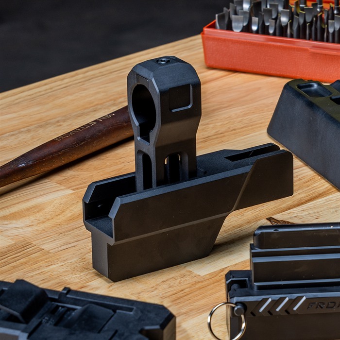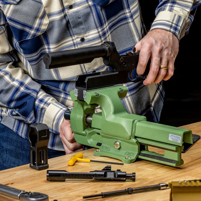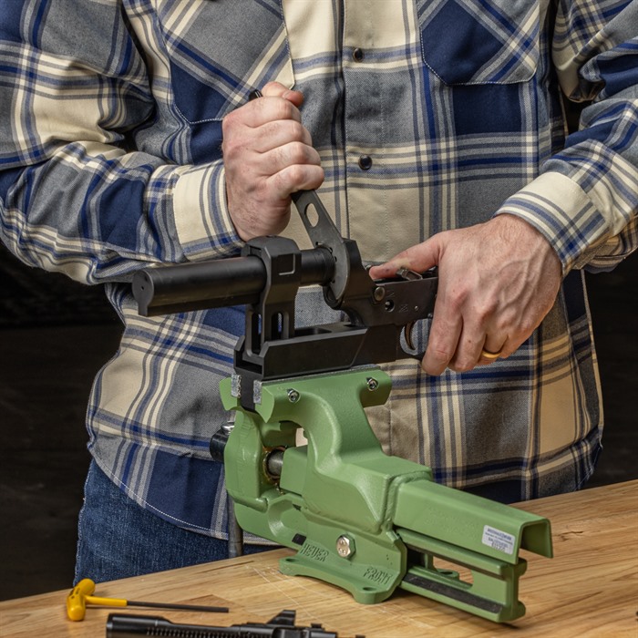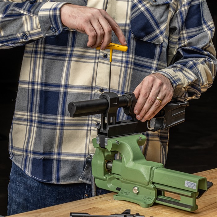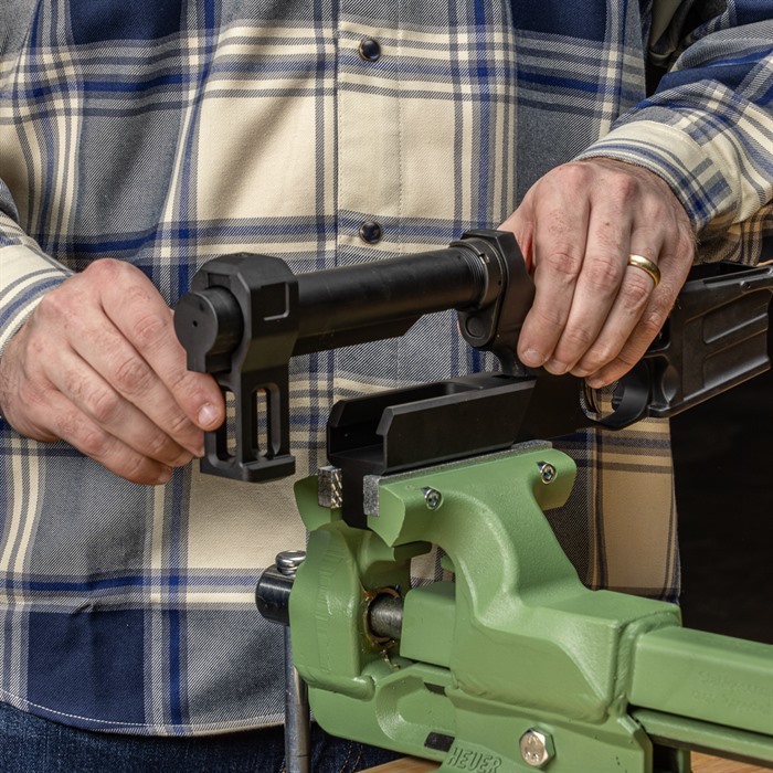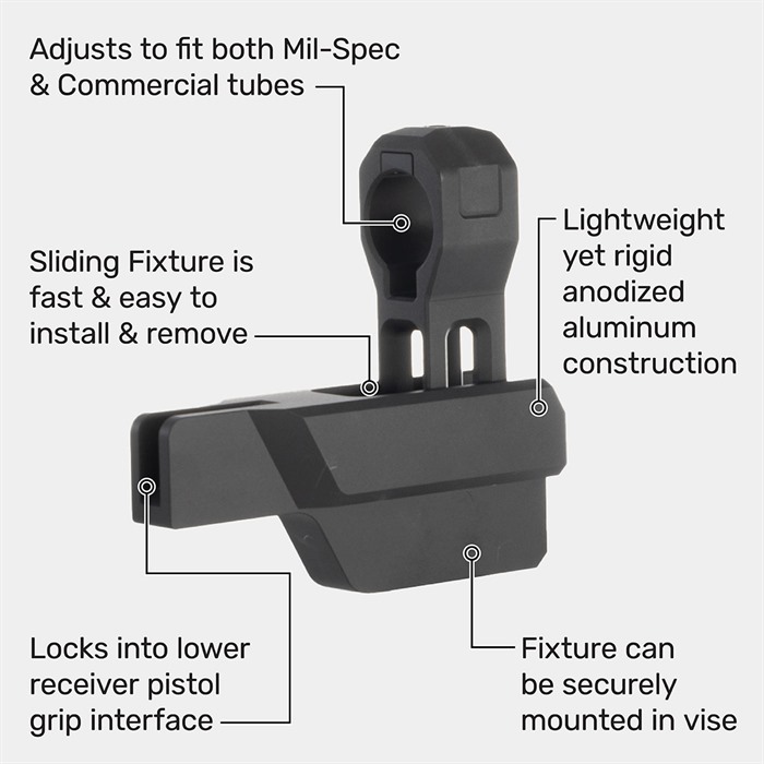 Realizzato in alluminio anodizzato, puoi inserire il fissaggio nel tuo vice preferito, come il Brownells Bench Vise, e serrarlo. Inserisci il ricevitore inferiore nel fissaggio con il tubo di buffer attraverso il supporto del tubo scorrevole. Sposta il supporto del tubo scorrevole verso il ricevitore, lasciando abbastanza spazio per una chiave per armieri. Regola il supporto per tubi mil-spec e commerciali semplicemente utilizzando una vite di regolazione sulla parte superiore del supporto del tubo scorrevole.