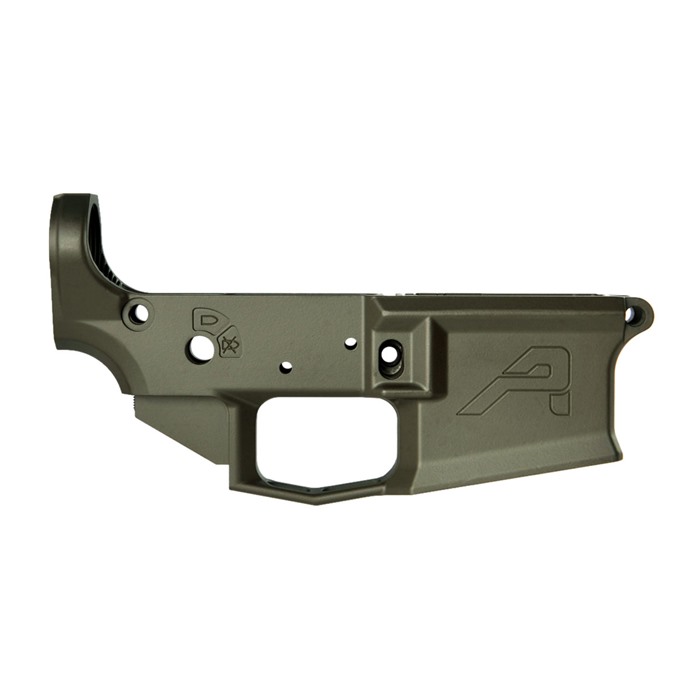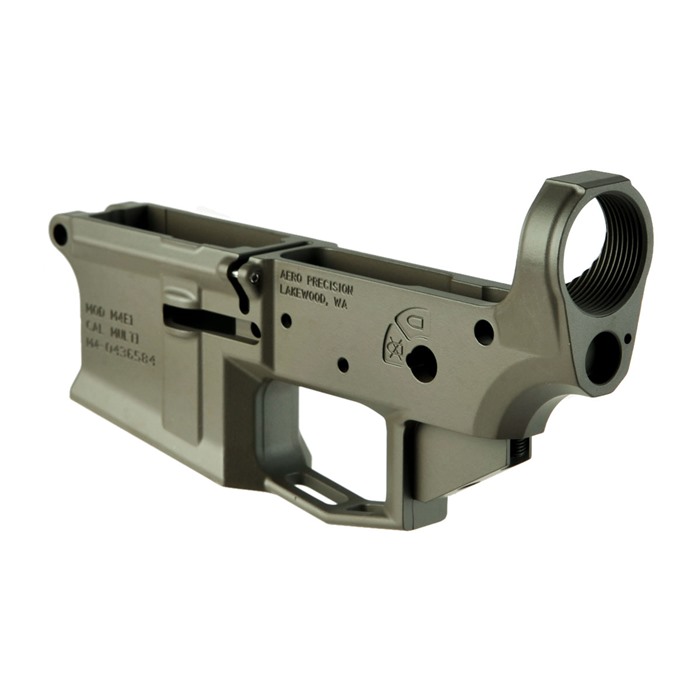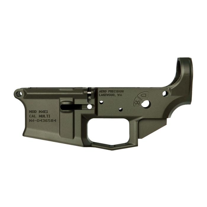 Aero Precision’s M4E1 Stripped Lower Receiver delivers the strength and unique looks of a billet machined lower, with the lower cost, lighter weight, and easy parts compatibility of a forged lower. The M4E1 starts as an "enhanced" forging from extra-strong 7075 T6 aluminum that is precision machined to final dimensions for compatibility with all standard "mil-spec" AR-15 parts. As a bonus, the good-looking M4E1 has a streamlined profile, without the chunky appearance of many milled lowers. Actually, the Aero Precision M4E1 Stripped Lower Receiver is not quite "stripped." Extra benefits include an integral triggerguard, which creates a more rigid, structurally sound receiver than a standard AR-15 lower, and also eliminates the risk of accidentally breaking off a triggerguard tab when working on the rifle. The enlarged triggerguard opening gives extra clearance so you can easily operate the trigger when wearing gloves. The M4E1 comes with an easy-to-install threaded bolt catch roll pin that eliminates the risk of damaging the lower’s finish during installation (OK, you may be able to still do damage, but you’ll have to work hard at it!). Other features of the Aero Precision M4E1 stripped lower include: Flared magwell opening facilitates fast, one-shot mag changes Threaded takedown pin detent recess for easy buffer removal without chasing down a flyaway detent! Accepts standard mil-spec AR-15 fire control components, pistol grip, buffer tubes & stocks Hardcoat anodized to resist surface wear, in Matte Black or Cerakote™ Flat Dark Earth The Aero Precision M4E1 Stripped Lower Receiver even has a polymer-tipped tensioning screw nestled in the grip tang that you can adjust for a tight, rattle-free fit with the upper receiver. All the benefits of a custom machined lower without the downside!