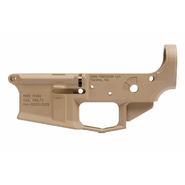 Aero Precision’s M4E1 Stripped Lower Receiver delivers the strength and unique looks of a billet machined lower, with the lower cost, lighter weight, and easy parts compatibility of a forged lower. The M4E1 starts as an "enhanced" forging from extra-strong 7075 T6 aluminum that is precision machined to final dimensions for compatibility with all standard "mil-spec" AR-15 parts. As a bonus, the good-looking M4E1 has a streamlined profile, without the chunky appearance of many milled lowers. Actually, the Aero Precision M4E1 Stripped Lower Receiver is not quite "stripped." Extra benefits include an integral triggerguard, which creates a more rigid, structurally sound receiver than a standard AR-15 lower, and also eliminates the risk of accidentally breaking off a triggerguard tab when working on the rifle. The enlarged triggerguard opening gives extra clearance so you can easily operate the trigger when wearing gloves. The M4E1 comes with an easy-to-install threaded bolt catch roll pin that eliminates the risk of damaging the lower’s finish during installation (OK, you may be able to still do damage, but you’ll have to work hard at it!). Other features of the Aero Precision M4E1 stripped lower include: Flared magwell opening facilitates fast, one-shot mag changes Threaded takedown pin detent recess for easy buffer removal without chasing down a flyaway detent! Accepts standard mil-spec AR-15 fire control components, pistol grip, buffer tubes & stocks Hardcoat anodized to resist surface wear, in Matte Black or Cerakote™ Flat Dark Earth The Aero Precision M4E1 Stripped Lower Receiver even has a polymer-tipped tensioning screw nestled in the grip tang that you can adjust for a tight, rattle-free fit with the upper receiver. All the benefits of a custom machined lower without the downside!
