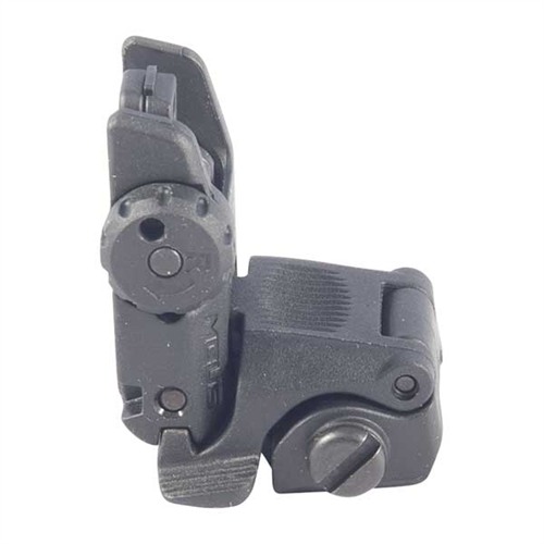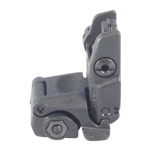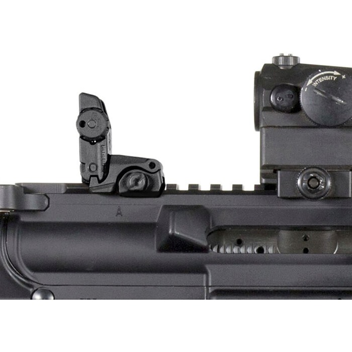 Low-profile, flattop-mounted, polymer sights deploy instantly at the touch of a finger to provide backup sighting if a primary optic fails. Streamlined contours mean there’s nothing to snag on brush, sling, or other gear when folded. Spring-loaded ambidextrous release mechanism lets you hit the grooved tab on either side of the sight to deploy, and lock it in place. Hitting the same tabs retract the sight when you’re done. Uses less than 1" of MIL-STD 1913 Picatinny receiver rail space and locks securely in place with the included steel crossbolt. Provides the same height over bore as standard A2 iron sights. Windage-adjustable rear sight has two apertures: a large, .185" peep and a .070" peep. Designed for AR-type rifles and carbines, fits any weapon with Picatinny rails.