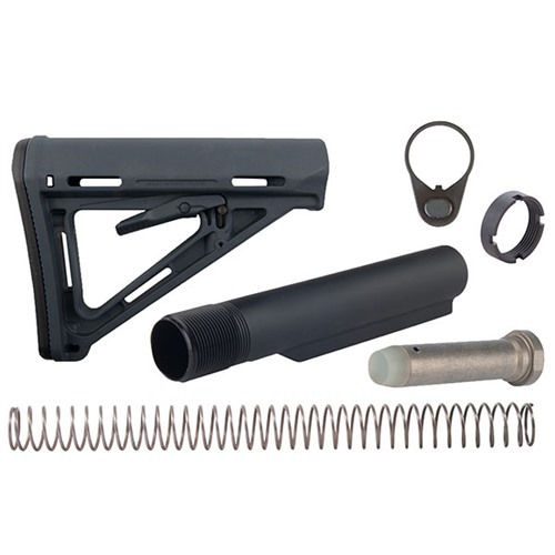 Magpul Original Equipment (MOE) carbine buttstock provides the quality, durability, and ergonomic benefits of Magpul’s CTR stock in a rugged, economical, drop-in package. Strong, A-frame design is lightweight and comfortable, yet provides operator with plenty of support. Comb contour is wider than standard issue M4 stock to help shooter maintain a solid, consistent cheekweld. Streamlined exterior and protected release lever won’t snag on clothing, gear, vehicle interior, or vegetation. Heavy duty, spring-loaded release lever allows fast length-of-pull adjustments and won’t dig into your hand. Impact- and heat-resistant, polymer construction includes molded-in reinforcements at stress points, plus two slots for web slings and a hole for a toe-mounted sling swivel or clip-on sling. Soft, synthetic rubber buttpad increases comfort and helps prevent slippage. Available in Black, Dark Earth, and O.D. Green. The MOE Carbine Buttstock Kit includes the following items: Mil-Spec Buffer Tube Carbine Buffer Chrome Silicone M-4 Recoil Spring Receiver End Plate Receiver Extension Castle Nut
