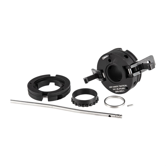 The Cry Havoc Tactical QRB (Quick Release Barrel) 1 Pin Upper Receiver Takedown Kit for AR-15 style rifles or pistols. Change calibers in seconds! The QRB allows you to remove the barrel of your rifle or pistol quickly. No drilling or modifications needed! Fit your AR-15 Carbine or Pistol into a Backpack or Bugout Bag with ease. Perfect for discreet transport. Assemble and Fire in seconds, even in low light. Able to KEEP strong hand on grip - Nothing to Depress or twist with strong hand. Use gross motor skills to assemble due to two-piece gas system. No lining up tiny gas access hole with gas tube first! Able to use a wide range of Free Float Hand Guards for the attachment of Back-up Iron Sights and accessories. Super-fast barrel and upper cleaning. The QRB can retain POA/POI as the barrel still ""head-spaces"" off the stock positions (our tests have shown accuracy retained to less than 1 MOA of original rifle setup!). With the purchase of an additional Barrel Lock Plate, switching to a different barrel length or caliber, like the 300 Blackout, takes just seconds! Proudly made in the USA The QRB Kit can only be used on Barrels with a maximum outside diameter of 0.985"" and Free Float Hand Guards with a maximum width of 2.0"" Also the QRB will add 1.5"" to the length of your free-floating hand guard. To purchase the proper kit simply selection the gas tube option that matches up with your barrels gas system length. A kit designed for pistol caliber AR’s that does not include a gas tube is available as well. Includes Barrel Plate, Receiver Plate, Star Nut, and Receiver Plate alignment Pin.
