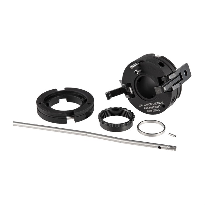 The Cry Havoc Tactical QRB (Quick Release Barrel) 1 Pin Upper Receiver Takedown Kit for AR-15 style rifles or pistols. Change calibers in seconds! The QRB allows you to remove the barrel of your rifle or pistol quickly. No drilling or modifications needed! Fit your AR-15 Carbine or Pistol into a Backpack or Bugout Bag with ease. Perfect for discreet transport. Assemble and Fire in seconds, even in low light. Able to KEEP strong hand on grip - Nothing to Depress or twist with strong hand. Use gross motor skills to assemble due to two-piece gas system. No lining up tiny gas access hole with gas tube first! Able to use a wide range of Free Float Hand Guards for the attachment of Back-up Iron Sights and accessories. Super-fast barrel and upper cleaning. The QRB can retain POA/POI as the barrel still ""head-spaces"" off the stock positions (our tests have shown accuracy retained to less than 1 MOA of original rifle setup!). With the purchase of an additional Barrel Lock Plate, switching to a different barrel length or caliber, like the 300 Blackout, takes just seconds! Proudly made in the USA The QRB Kit can only be used on Barrels with a maximum outside diameter of 0.985"" and Free Float Hand Guards with a maximum width of 2.0"" Also the QRB will add 1.5"" to the length of your free-floating hand guard. To purchase the proper kit simply selection the gas tube option that matches up with your barrels gas system length. A kit designed for pistol caliber AR’s that does not include a gas tube is available as well. Includes Barrel Plate, Receiver Plate, Star Nut, and Receiver Plate alignment Pin.