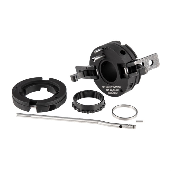 The Cry Havoc Tactical QRB (Quick Release Barrel) 1 Pin Upper Receiver Takedown Kit for AR-15 style rifles or pistols. Change calibers in seconds! The QRB allows you to remove the barrel of your rifle or pistol quickly. No drilling or modifications needed! Fit your AR-15 Carbine or Pistol into a Backpack or Bugout Bag with ease. Perfect for discreet transport. Assemble and Fire in seconds, even in low light. Able to KEEP strong hand on grip - Nothing to Depress or twist with strong hand. Use gross motor skills to assemble due to two-piece gas system. No lining up tiny gas access hole with gas tube first! Able to use a wide range of Free Float Hand Guards for the attachment of Back-up Iron Sights and accessories. Super-fast barrel and upper cleaning. The QRB can retain POA/POI as the barrel still ""head-spaces"" off the stock positions (our tests have shown accuracy retained to less than 1 MOA of original rifle setup!). With the purchase of an additional Barrel Lock Plate, switching to a different barrel length or caliber, like the 300 Blackout, takes just seconds! Proudly made in the USA The QRB Kit can only be used on Barrels with a maximum outside diameter of 0.985"" and Free Float Hand Guards with a maximum width of 2.0"" Also the QRB will add 1.5"" to the length of your free-floating hand guard. To purchase the proper kit simply selection the gas tube option that matches up with your barrels gas system length. A kit designed for pistol caliber AR’s that does not include a gas tube is available as well. Includes Barrel Plate, Receiver Plate, Star Nut, and Receiver Plate alignment Pin.