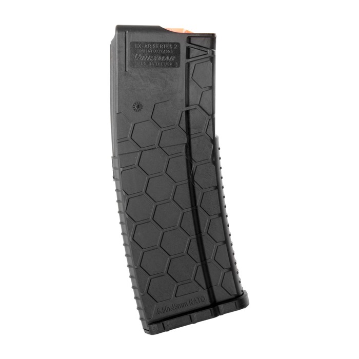 Il caricatore viene fornito assemblato con un follower arancione Hexmag e una piastra di bloccaggio, ed è compatibile con HexID. I caricatori Hexmag presentano una presa superiore grazie a un design brevettato con un motivo esagonale rialzato e un corpo in polimero resistente agli urti.