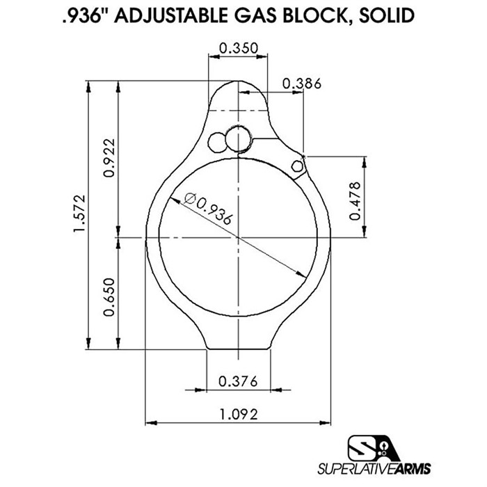 The Superlative Arms patented “Bleed Off”, direct impingement, gas block for the AR15 platform adjusts the gas flow by bleeding the gas out of the block instead of restricting the flow like conventional adjustable blocks. Results: The pressure used in the block is reduced only to the amount required to drive the bolt carrier. The remaining gas / pressure are bled out of the block allowing the system to run much cleaner and cooler. Reduction of felt recoil. Patented adjustment detent is located outside of the block and therefore no contamination. The gas adjustment screw does not restrict the gas flow; therefore there is no erosion or seizing of the screw / no loss of detent due to carbon build up. Although it is removable, we have added a safety mechanism, which stops you from unintentionally backing the screw all the way out. When using SBR’s and / or suppressors the bleed off port allows the excessive pressure to be exhausted out of the block reducing blow back. Data: Gas Block Material: 416 SS Barrel Diameter: 0.625" Weight: 1.37 oz. Length: 1.00" Attachment Type: Solid Gas Adjustment: 30 Locked Positions, Front Of Block Bleed Off Port: Front Of Block Included: Gas Block - Assembled (2) 10-32 x 3/16" Set Screws (1) Gas Tube Roll Pins (1) 3/32 X 6" L-Shaped Hex Keys Installation Instructions & QR code for video tutorial