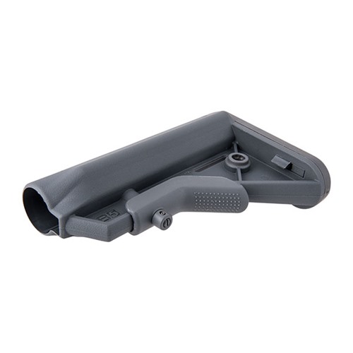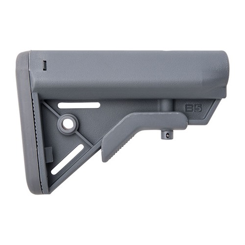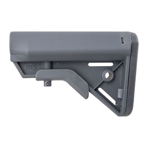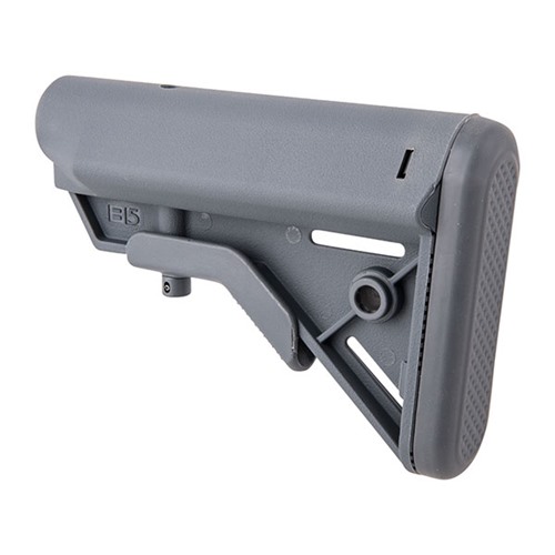 B5 SYSTEMS BRAVO COLLAPSIBLE MIL-SPEC STOCK FOR AR-15 Building upon the success of the B5 Systems Enhanced SOPMOD, B5 has taken the features end users demand; offering them in a lighter, more compact, and stronger buttstock. The Bravo stock maintains the SOPMOD cheek weld, one piece anti-rotation quick disconnect sling mount, non-slip cushioned buttpad, and improved sure grip stock latch. The Bravo omits the storage capability of the SOPMOD to provide a slimmer profile and angles the rear of the stock ensuring quick and consistent stock placement against the shoulder and cheek. Made of Mil-Spec materials and finishes. Currently employed by the U.S. military, this reinforced polymer stock fits M4-type receiver extensions and offers an improved cheekweld designed for increased comfort and consistency. Streamlined contours resist snagging on clothing, equipment, or vegetation to aid in safe and stealthy operation. Sure-Grip stock latch ensures convenient and intuitive length-of-pull adjustment, while the anti-slip rubber recoil pad secures the weapon to the operator’s shoulder. Features a black, stainless steel QD swivel mount and two molded 1¼" wide sling slots. FEATURES Ergonomic Cheek Weld Color-Matched Steel Hardware Fixed Sling Mounts and Steel Anti-Rotational QD Mounts Cushioned Non-slip Buttpad with Built in M4 Multi-Tasker® Tool Holder (tool sold separately) Sure Grip Stock Latch Made of MIL-SPEC Materials and Finishes Fits MIL-SPEC Carbine Receiver Extensions SPECS Weight: 9.3 oz Length: 7.2 in Width: 2 in Height: 4.9 Black and Tan models are TACOM approved and on the Additional Authorization List (AAL) for the M4/M4A1. Black NSN: 1005-01-706-2373 Flat Dark Earth NSN: 1005-01-706-2510