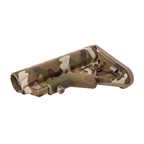 Le linee fluide resistono all'aggancio su abbigliamento, attrezzature o vegetazione, facilitando operazioni sicure e furtive. Il gancio per il calcio Sure-Grip garantisce un aggiustamento della lunghezza del calcio conveniente e intuitivo, mentre il pad di riciclo in gomma antiscivolo fissa l'arma alla spalla dell'operatore. Presenta un attacco QD in acciaio inossidabile nero e due slot per slitta da 1¼" modellati.