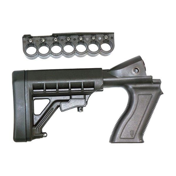 The Archangel© AA87088 is an advanced tactical stock system for Remington© Model 870™ 12 gauge Shotguns. An ergonomic textured pistol grip with locking storage enhances weapon retention and control. A teardrop shape extension tube cheek weld shape assists in a natural sight picture with bead type or barrel mounted sights. An included cheek riser can be user installed for instant cheek alignment with raised sights or optical sight systems (sights not included). A six position collapsible buttstock with patented durometer tuning system allows shooters of all sizes to find the optimum adjustment for fit and comfort. The patented, individual tension adjustable, seven round shell carrier mounts to the left side of the receiver and won’t interfere with the stroke of military length forends. A captured rubber gasket protects the finish of y shotgun where the shell carrier plate mates with the receiver. Constructed of legendary high strength, carbon fiber and glass reinforced black polymer, this rig is impervious to weather, all standard gun solvents and oils, and will withstand a lifetime of hard use. Lifetime warranty. Made in USA. Fits the Remington© Model 870™ 12 gauge shotgun Molded in quick detach hard points (left and right) (QD sling swivels not included) Patented, anti-snag interchangeable insert recoil pad (soft and firm inserts included) Constructed of legendary high strength, carbon fiber and glass reinforced black polymer Six (6) position collapsible buttstock is adjustable for 11" to 14.25" Ergonomic textured pistol grip with locking storage Pistol grip provides superior weapon retention and control Detachable cheek riser for raised sights or optics (sights not included) Seven (7) round shell carrier (AA112) No forend included Weight 1.4 pounds Lifetime Warranty* Made in USA