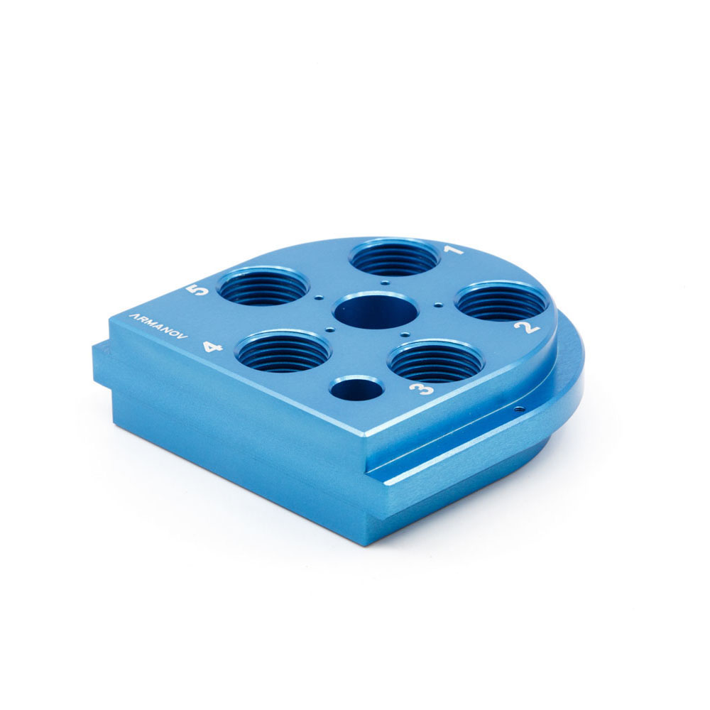 Questi toolheads sono realizzati secondo i più alti standard. Sono lavorati CNC in alluminio 6082, che è molto più resistente e ha meno flessibilità rispetto a un toolhead in fusione. Tutte le dimensioni critiche sono lavorate in un'unica operazione, garantendo che tutte le superfici siano vere e allineate tra loro. I fori per i dies sono posizionati con un alto grado di precisione e le filettature 7/8-14 sono lavorate con tolleranze strette per una vestibilità e un allineamento precisi, consentendo ai dies di essere più precisamente centrati in ogni foro e meglio allineati ai bossoli nel piatto di caricamento. La flangia è anche più piatta rispetto a quanto si possa ottenere con un toolhead in fusione.