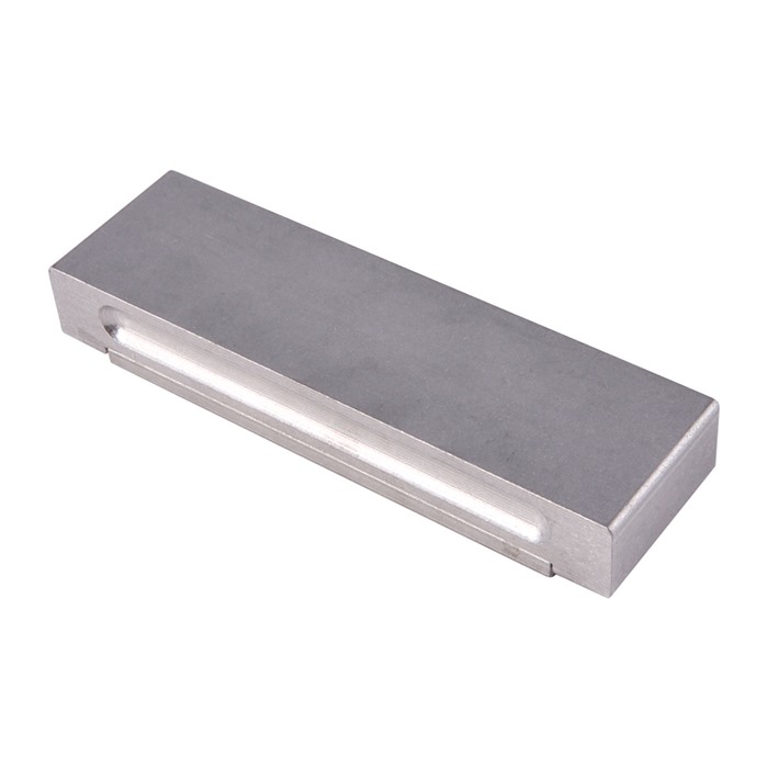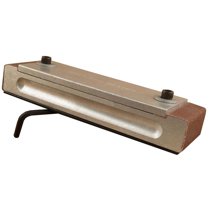 Harrison Design and Consulting have used these 2"x7" aluminum sanding block in their shop for years to be able to level and sand out slide and frame flats to any level of polish that their clients have ordered. They think they work so well, that they wanted to offer them for sale. The clamp plate keeps the abrasive paper pulled taught, while the finger and thumb grooves on the sides help you control and direct the block without tiring you out, trying to keep the paper taught, like on a makeshift sanding block. Harrison Design and Consulting's sanding blocks use a 2" wide piece of sandpaper or 2" wide emory strip. They recommend sheet sandpaper in 9"x11" sheets and then advise you tear it length-wise, procure 3 strips 2" wide, plus another 1" wide strip that you could save for general shoe-shine blending. Harrison Design and Consulting include a loose piece of 2" wide 7" long 40 durometer Buna-N rubber that you can use between the abrasive paper and sanding block at your option. When sanding out flats that are a little wavy and they have roll marks, they normally use the rubber to allow some give in the sandpaper and help it follow the surface, rather than forcing it to level the surface. When you've worn out a piece of paper, tear off those un-used ends and save them for wrapping around sanding sticks and files to sand small surfaces.