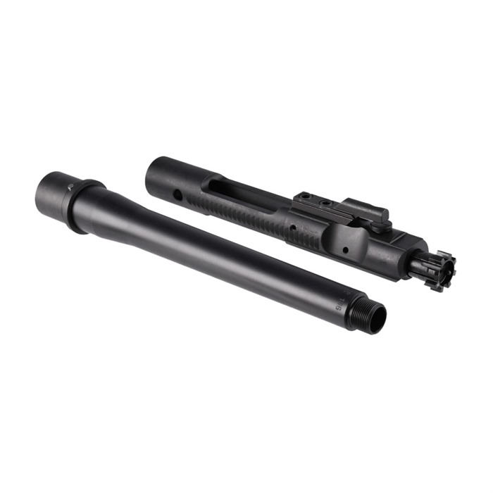 The CMMG MkG Barrel and BCG Kit allow you to build a Pistol Caliber Carbine using their Patent Pending Radial Delayed Blowback System. Unlike typical direct blowback systems, the CMMG RDB uses a bolt that is forced to rotate and unlock, slowing the BCG. This results in a lighter BCG for a lighter rifle, and less felt recoil than a straight blowback system. While the CMMG GUARD 45 was designed for .45 ACP, they have tested it, and are proud to say that it is safety rated to fire 450 SMC. The MkG Barrel and Bolt Kits are designed to work exclusively with CMMG’s MkG Lowers, and a mil-spec upper receiver with an enlarged ejection port. Other manufacturers’ receivers may work, but CMMG cannot guarantee function or reliability. Radial Delayed Blowback Bolt (Patent Pending) Requires enlarged ejection port for reliable operation Chambered in .45ACP Available in 5” or 8” lengths Medium Taper Contour .578x28 threads 1-16 Barrel Twist Salt Bath Nitride Finish