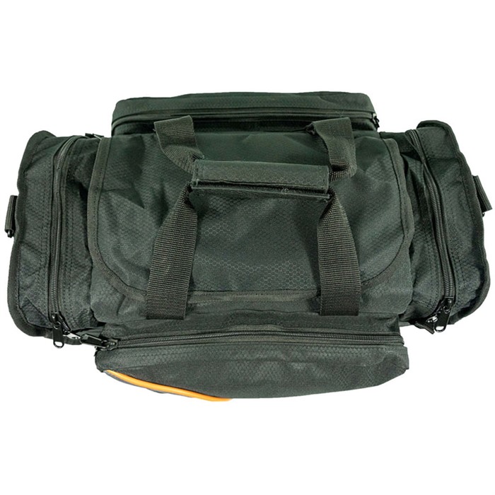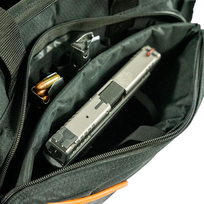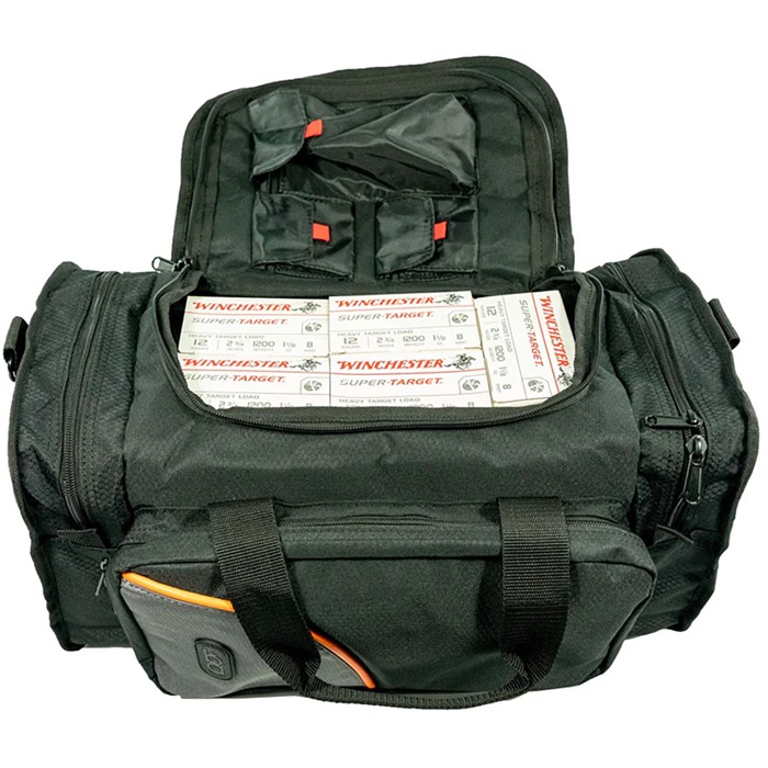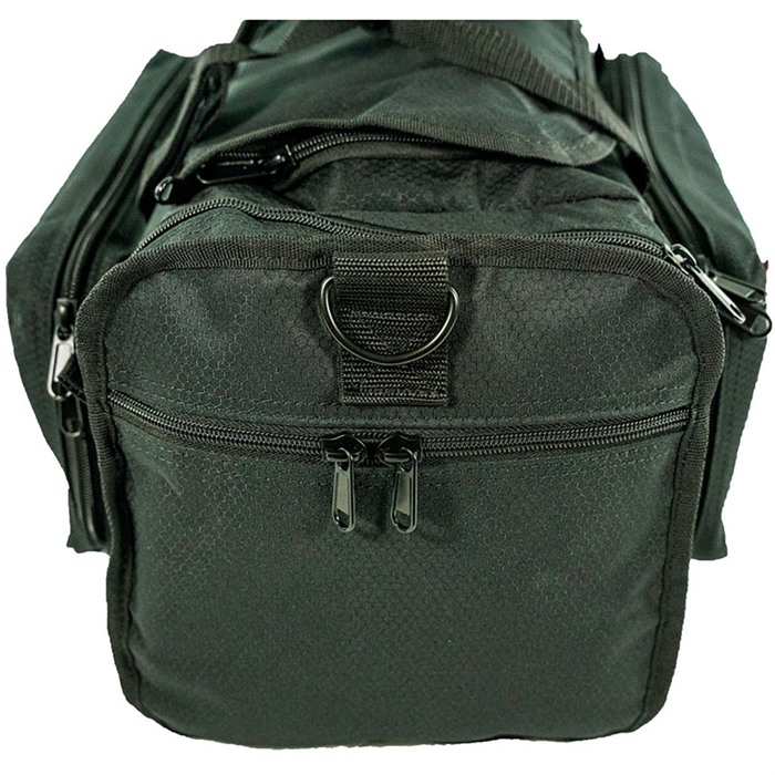 BOB ALLEN CLUB SERIES RANGE BAG FEATURES: Ripstop nylon construction Padded interior pockets perfect for pistols Internal glasses and ear protection pockets Zippered front, back, and side pockets Magazine loops Wrap around handles with adjustable loops to carry baton or flashlight Adjustable shoulder strap Overall external measurements: 18" x 10" x 10"