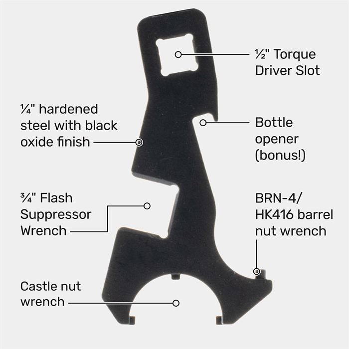 La chiave combinata BRN-4 / HK416 di Brownells è stata progettata come un attrezzo tutto-in-uno per eseguire la maggior parte delle operazioni di smontaggio e rimontaggio con facilità.