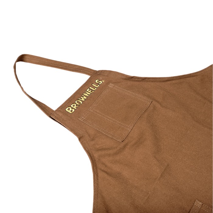 A Premium-Quality Shop Apron Sized for Good Coverage & Minimal Bulk Our shop aprons have been mainstays of gunsmiths' workbenches for decades, the "Brownells" logo on the front an enduring symbol of quality and durability. Our Short Shop Apron offers all of the features of our standard apron in a shorter length for folks who don't need full coverage or want minimal restriction of movement. Durable, all-cotton canvas construction stands up to the rigors of daily shop use. Seams are double-stitched and rolled for extra strength, with every corner and stress point bar-tacked for reinforcement. Solvent- and oil-resistant nylon thread is used for all the stitching to ensure a long service life. This Short Shop Apron has three (3) handy pockets on the front include a high centered upper pocket with a dedicated pen/pencil slot, plus spacious lower pockets on each side for additional storage. There's another pocket on the inside at the top of the bib for holding your phone or other items you want at your fingertips. Shorter length gives good coverage, no restriction of movement Durable all-cotton canvas construction Robust double-stitched seams & reinforced stress points Easy-closure adjustable neck strap for perfect fit Four (4) handy pockets (3 outside, 1 inside) The hook-and-loop closure on the neck strap lets you adjust the bib for a secure fit and maximum coverage. The Brownells logo is tastefully embroidered on the front lets the whole world know who your favorite firearm supplier is. Our Short Shop Apron is easy to care for: when it gets dirty, just machine wash and dry it without worrying about the edges curling or the shape distorting. It'll stand up to many washing cycles, so you can always look spiffy for your customers.