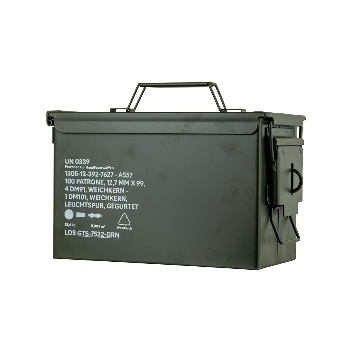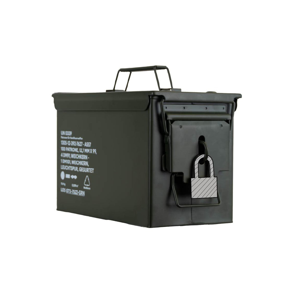 0792649433386 The German Tactical Systems BW Ammo Can (NATO Size 2 (12.7 mm / .50 Cal) is built from rugged tinplate steel, providing dependable protection against dust, moisture, and impacts. Designed for demanding use in the field, during transport, or in storage, it keeps your ammunition and gear secure in any environment. A continuous rubber gasket ensures a tight seal, while the heavy-duty lever-lock latch keeps the lid firmly closed. For extra security, the integrated padlock tab allows you to lock the contents. The foldable steel carry handle makes transport comfortable, even with gloves, and the stackable design is ideal for organized storage and logistics. Key Features: NATO Size 2 (12.7 mm / .50 Cal) – new production from robust tinplate steel Strong lever-lock latch for secure closure Continuous rubber gasket for dust and moisture protection Foldable steel handle for safe, comfortable carrying Integrated padlock tab for added security (lock not included) Stackable design – ideal for storage and transport Color: NATO Green Perfect for storing ammunition, tools, or mission-critical equipment, the GTS BW Ammo Can delivers military-grade reliability for professionals and enthusiasts alike. Pair it with the GTS Gear Dehumidifier to keep contents dry and corrosion-free for long-term storage.Tempi di consegna circa 3-6 giorni.
