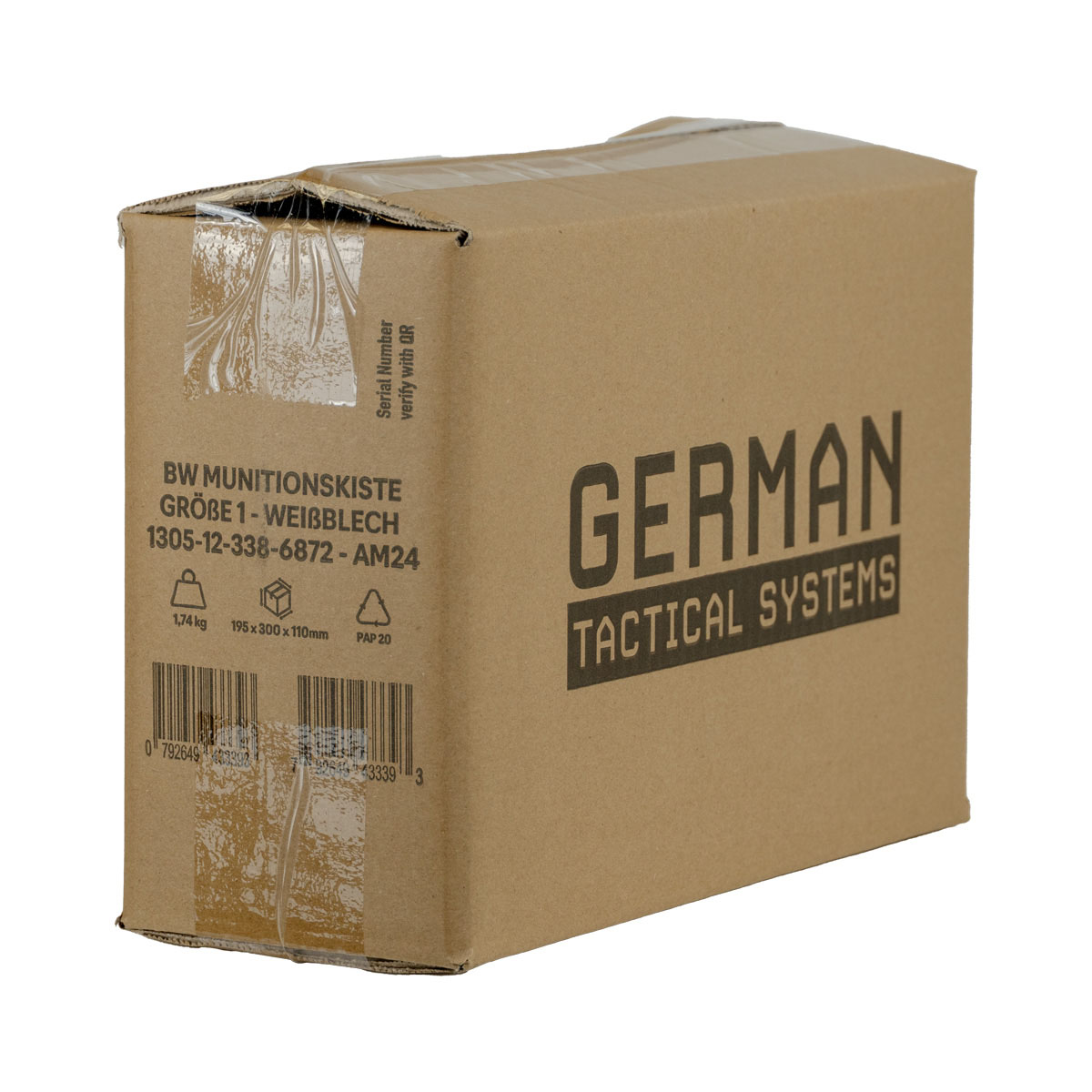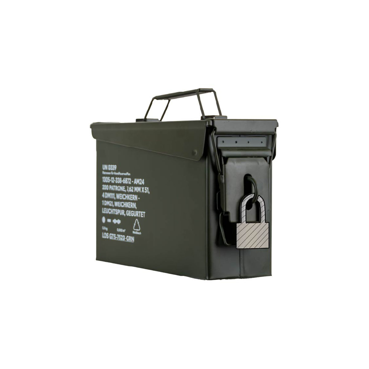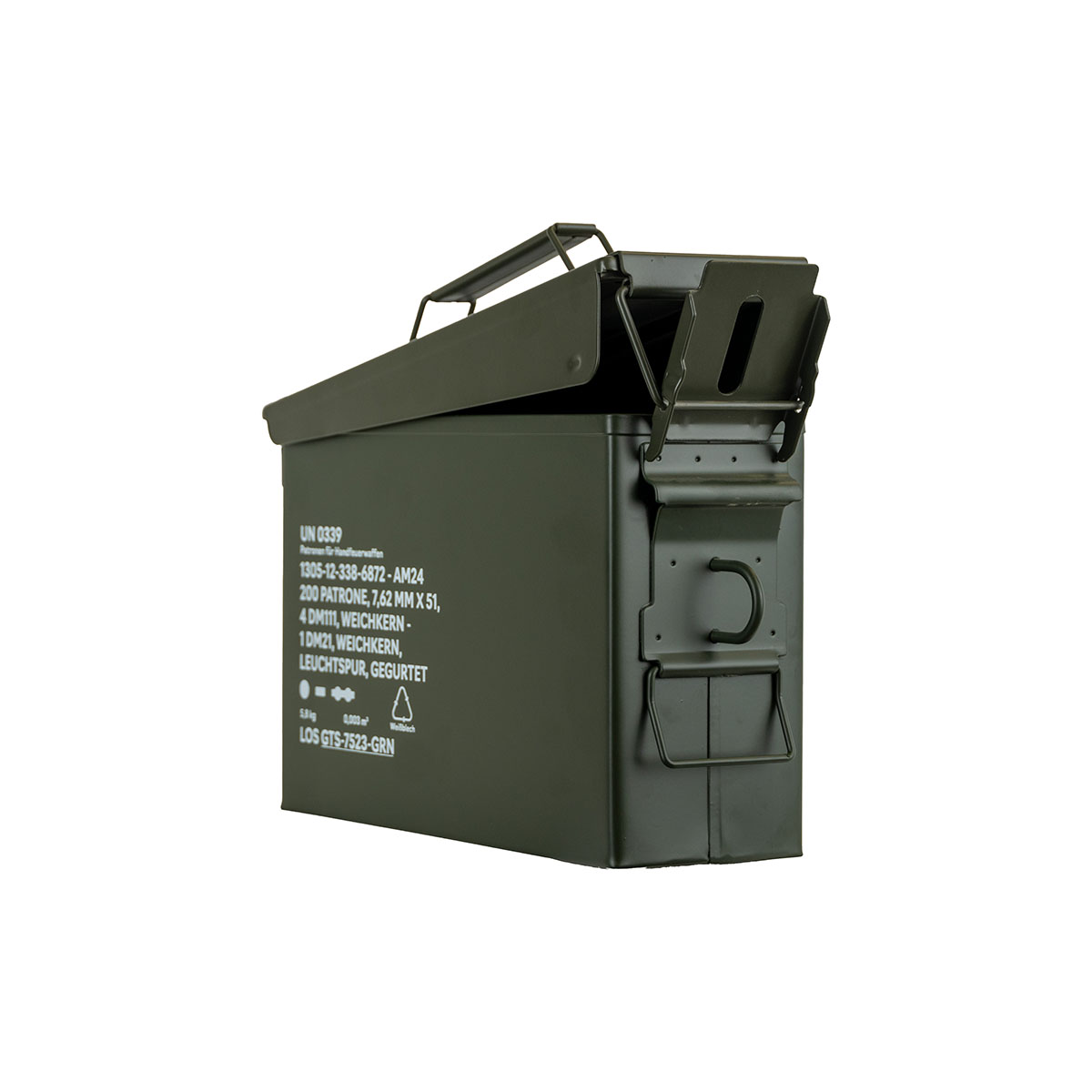0792649433393 The German Tactical Systems BW Ammo Can (NATO Size 1 – 7.62 mm / .30 Cal) is built from rugged tinplate steel, providing dependable protection against dust, moisture, and impacts. Designed for demanding use in the field, during transport, or in storage, it keeps your ammunition and gear secure in any environment. A continuous rubber gasket ensures a tight seal, while the heavy-duty lever-lock latch keeps the lid firmly closed. For extra security, the integrated padlock tab allows you to lock the contents. The foldable steel carry handle makes transport comfortable, even with gloves, and the stackable design is ideal for organized storage and logistics. Key Features: NATO Size 1 (7.62 mm / .30 Cal) – new production from robust tinplate steel Strong lever-lock latch for secure closure Continuous rubber gasket for dust and moisture protection Foldable steel handle for safe, comfortable carrying Integrated padlock tab for added security (lock not included) Stackable design – ideal for storage and transport Color: NATO Green Perfect for storing ammunition, tools, or mission-critical equipment, the GTS BW Ammo Can delivers military-grade reliability for professionals and enthusiasts alike. Pair it with the GTS Gear Dehumidifier to keep contents dry and corrosion-free for long-term storage.Tempi di consegna circa 3-6 giorni.
