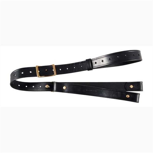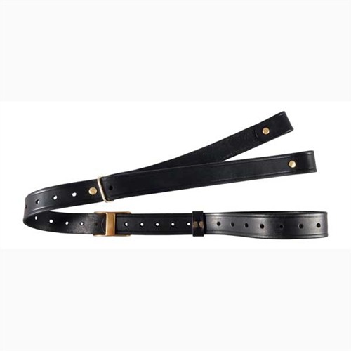 SPECS: Leather, black, with brass hardware. 44" (112cm) long x 1" (2.5cm) or 1¼" (3.2cm) wide. Ching Specialty also available in chestnut brown, includes center strap, 9" (23cm) long. Sling swivels not included.