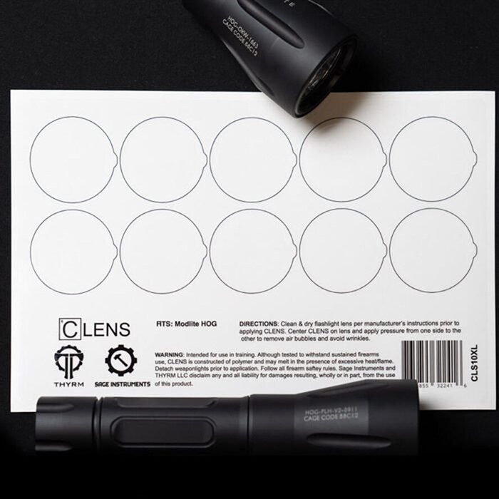 CLENS LENS PROTECTION FOR FLASHLIGHTS AND WEAPON LIGHTS Lights only work well when their lenses are clean. Each CLENS Protector provides an easy way to protect lenses during extended shooting sessions. Just like goggle tear-offs for off-road riding, just remove the dirty CLENS to return your light to its optimal brightness. CLENS (pronounced “cleanse”) come as a set of heat-resistant clear polymer circles, cut to fit on a wide range of flashlight and weapon-light lenses. Each CLENS Protector protects the lens from carbon and other debris that can build up during firearms training. Each CLENS Protector has a small tear-away tab. The CLENS Protector can be removed to quickly clean a light, rather than having to apply Vaseline before shooting, replace a lens, or risk abrasion with lens cleaners. Each CLENS’ mild adhesive backing has a higher affinity for polymer than glass. Attach and position easily, without leaving adhesive on clean glass. However, the adhesive may stick to a dirty or damaged lens. In this case, touching the sticky side of the CLENS to any residual adhesive should remove the adhesive from the lens. Designed and manufactured in the USA. * Follow all firearm safety rules at all times. Detach lights from firearms prior to installing, removing, cleaning, or replacing the CLENS.