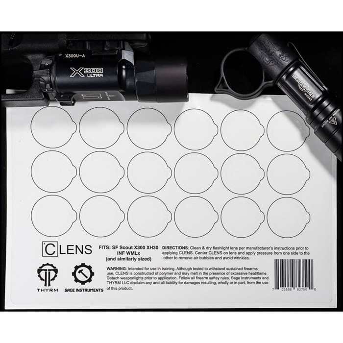 CLENS LENS PROTECTION FOR FLASHLIGHTS AND WEAPON LIGHTS Lights only work well when their lenses are clean. Each CLENS Protector provides an easy way to protect lenses during extended shooting sessions. Just like goggle tear-offs for off-road riding, just remove the dirty CLENS to return your light to its optimal brightness. CLENS (pronounced “cleanse”) come as a set of heat-resistant clear polymer circles, cut to fit on a wide range of flashlight and weapon-light lenses. Each CLENS Protector protects the lens from carbon and other debris that can build up during firearms training. Each CLENS Protector has a small tear-away tab. The CLENS Protector can be removed to quickly clean a light, rather than having to apply Vaseline before shooting, replace a lens, or risk abrasion with lens cleaners. Each CLENS’ mild adhesive backing has a higher affinity for polymer than glass. Attach and position easily, without leaving adhesive on clean glass. However, the adhesive may stick to a dirty or damaged lens. In this case, touching the sticky side of the CLENS to any residual adhesive should remove the adhesive from the lens. Designed and manufactured in the USA. * Follow all firearm safety rules at all times. Detach lights from firearms prior to installing, removing, cleaning, or replacing the CLENS.