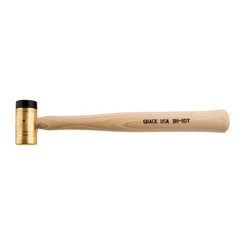 DELRIN-TIPPED BRASS HAMMER The Grace USA Delrin-Tipped Brass Hammer is a high-quality tool designed for gunsmiths, firearm enthusiasts, and precision craftsmen. Manufactured in the USA, this hammer combines durability and precision, making it an essential addition to any toolkit. Key Features: Dual-Purpose Head: This hammer features a solid brass head for delivering strong, effective strikes and a replaceable Delrin tip for softer, non-marring impacts. This dual design ensures versatility for a range of gunsmithing tasks. Premium Brass Construction: The brass head is made from high-quality CDA 360 brass rod, hand-polished for exceptional durability and performance. Replaceable Delrin Tip: The Delrin tip provides a protective, non-marring surface, ideal for delicate tasks that require safeguarding finishes or intricate components. Ergonomic Hickory Handle: The handle, crafted from properly seasoned hickory, offers a comfortable grip and excellent control during extended use. It is securely pinned to the head for added stability. Specifications: Face Dimensions: 1” Length of Head: 2.1” Overall Hammer: 10” Applications: The Grace USA Delrin-Tipped Brass Hammer is ideal for tasks such as driving pins, aligning parts, and performing firearm assembly or maintenance. Its dual-head design offers flexibility, making it suitable for both heavy-duty and precision work. Customer Feedback: Users commend the hammer’s exceptional craftsmanship, highlighting its durability and ergonomic design. Many reviewers appreciate the utility of the replaceable Delrin tip, which ensures precision while protecting sensitive surfaces. Summary: The Grace USA Delrin-Tipped Brass Hammer is a versatile and reliable tool for gunsmiths and firearm enthusiasts. With its premium materials and thoughtful design, it delivers the precision and durability required for a wide range of tasks, ensuring consistent and professional results.