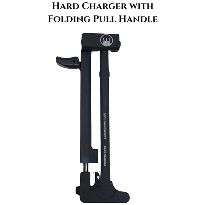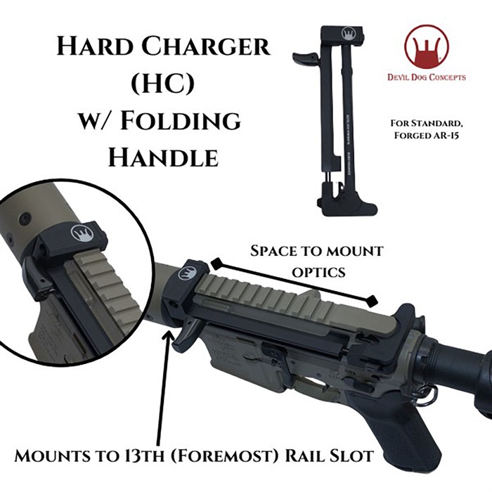 DEVIL DOG CONCEPTS HARD CHARGER SIDE CHARGING HANDLE W/FOLDING HANDLE FOR AR-15 Hard Charger® with Folding Handle - for Standard Forged, Mil-Spec AR-15/M4 Rifles No longer do you have to rebuild your upper receiver or buy a new rifle to have the side charging capability!! Turn your rifle into a Side Charger without having to rebuild or modify it. Simply swap out the charging handle and install the Hard Charger. Takes a minute or less and you are up and running! The Hard Charger® mounts to the 13th Picatinny Rail and is designed to work on Standard, Forged, Mil-Spec Type Upper Receivers & Billet Rifles. Not designed for Billet Rifles. This design allows optic and sight mounting to the rear of the Hard Charger. This is the original Hard Charger, Side Charging Handle System. Hard Charger (HC), AR-15 Mil-spec, Forged Uppers only: mounts to the Foremost (13th) Picatinny rail slot replacing the existing charging handle. *Not designed for Billet rifles including Aero M4E1 FEATURES Devil Dog Concepts’ Side Charging Handle System = Ergonomically Beneficial Multiple Ways to Charge Interchangeable from Rifle to Rifle Non Reciprocating Removes Stress on Roll Pin Reduces Torque on Charging Handle Field Strippable Gross Motor Skills Plenty of Room for Mounting Optics and Sights SPECS For Standard, Forged Flat Top AR-15 Made from 7075 Aluminum Anodized Black, and Steel Weighs 6oz