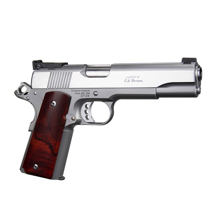 The Classic Custom includes all the classic modifications. Known as Ed Brown’s flagship firearm, this is some of their finest work, and many of their repeat customers say it's the finest pistol available anywhere, at any price. It has all the bells and whistles, and includes those extra enhancements that you don't really need, but really want! Many customers think of it as the proverbial safe queen, but don't let that fool you - it can take just as much hard service as any pistol out there. The unique slide treatment sets it apart from any other pistol. The sides of the slide are painstaking brought to a gleaming high polish finish, by hand, to contrast and enhance the glass bead finished frame. This gorgeous high polish finish really makes the Classic Custom stand out! The top of the slide features a custom rib for a no glare runway effect that naturally guides your eye to the gold bead front sight, and is finished out with 50 LPI serrations on the back to match the adjustable rear sight, and eliminate distracting light reflection. The frame is elegantly finished in 25 LPI checkering. We think you'll agree the Classic Custom represents the ultimate in quality firearm craftsmanship at its finest! 5" Government model slide, single stack government model frame 25 LPI checkering on forestrap and mainspring housing Special high polish slide 50 LPI serrations on back of slide to match serrated adjustable sight Adjustable rear sight buried deep into slide, gold bead front sight Two-piece guide rod for smoother cycling and easier disassembly Custom slide rib Smooth, Cocobolo wood grips