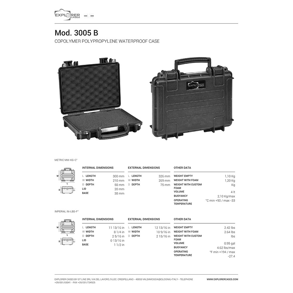 8024482181547 La migliore protezione per il tuo tesoro più prezioso - L'ultimate custodia per armi con una varietà di funzioni della massima qualità, prodotto da Explorer Cases in Italia. Specifiche: lunghezza : 326mm (300mm interno) Larghezza : 269mm (210mm interno) Profondità : 75mm (58mm interno) Peso : 1,20kg (1,10kg peso vuoto senza imbottitura) Colore : Nero Imbottitura : Pre-Cube Foam Letteralmente indistruttibile Le custodie per armi di Explorer Cases sono dotate di cerniere in metallo resistenti alla corrosione con funzione di ritenzione del coperchio, che fissano il coperchio e lo mantengono in posizione quando è aperto. Quindi puoi essere certo che le tue custodie per armi ti assisteranno a lungo. Grazie ai ganci di chiusura, le custodie per armi sono sempre altamente sicure. Il guarnizione O-ring le rende anche resistenti all'acqua in gran parte. Ogni custodia per armi è dotata di una valvola manuale di rilascio della pressione atmosferica. Pertanto puoi stare tranquillo e non avrai problemi a maneggiare e chiudere la custodia. Esattamente come vuoi Le custodie sono fornite di ritagli interni per supporti interni opzionali o anelli di montaggio, così puoi riporre tutto esattamente come è più adatto alle tue esigenze. Ogni singolo bagaglio è dotato di un'etichetta rimovibile impermeabile con la quale puoi etichettare la tua attrezzatura o memorizzare i tuoi dati. La custodia può essere trasportata tradizionalmente tramite la grande maniglia frontale o tramite spallacci opzionali, che possono essere facilmente attaccati a qualsiasi modello. La serie 3005 è ottimizzata per il trasporto in aereo.Spedizione diretta da fornitore. I tempi di consegna possono variare in base all'origine dei prodotti.