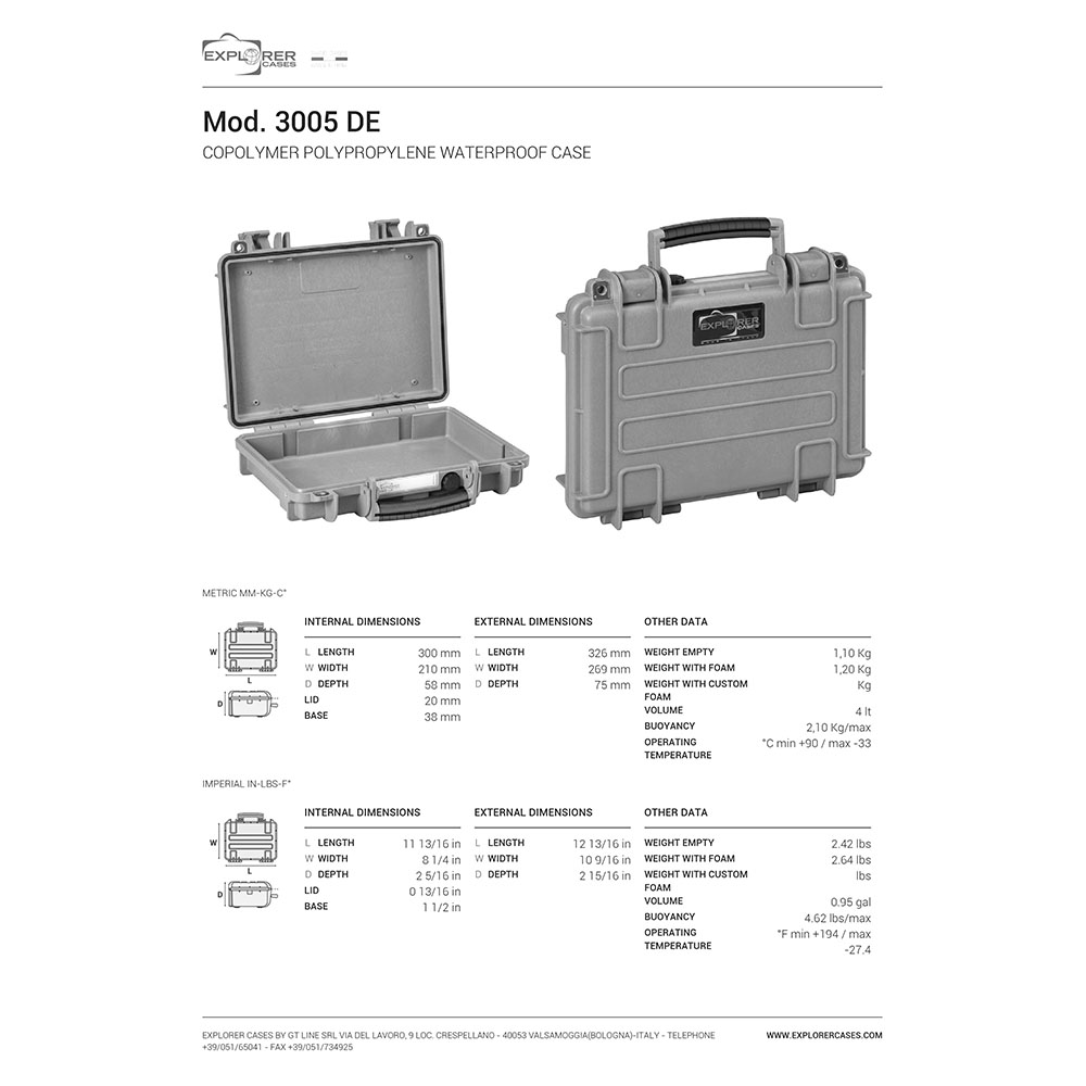 8024482181981 La migliore protezione per il tuo tesoro più prezioso - L'ultimate custodia per armi con una varietà di funzioni nella massima qualità, prodotto da Explorer Cases in Italia. Specifiche: lunghezza: 326mm (300mm interne) larghezza: 269mm (210mm interne) profondità: 75mm (58mm interne) peso: 1,10kg colore: Nero Letteralmente indistruttibile Le custodie per armi di Explorer Cases sono dotate di cerniere metalliche resistenti alla corrosione con caratteristiche di bloccaggio del coperchio, che fissano il coperchio e lo mantengono in posizione quando è aperto. Quindi puoi stare tranquillo che le tue custodie per armi ti assisteranno a lungo. Grazie ai ganci di bloccaggio, le custodie per armi sono sempre altamente sicure. La guarnizione O-ring le rende anche resistenti all'acqua in buona misura. Ogni custodia per armi è dotata di una valvola manuale di rilascio della pressione dell'aria. Pertanto puoi stare tranquillo e non avrai problemi a maneggiare e chiudere la custodia. Esattamente come lo desideri Le custodie sono fornite di ritagli interni per supporti interni opzionali o anelli di montaggio, in modo da poter riporre tutto esattamente come è più adatto alle tue esigenze. Ogni singola valigia è dotata di un'etichetta rimovibile impermeabile con cui puoi etichettare la tua attrezzatura o memorizzare i tuoi dati. La custodia può essere trasportata tradizionalmente tramite la grande maniglia frontale o tramite cinghie a spalla opzionali, che possono essere facilmente attaccate a qualsiasi modello. La serie 3005 è ottimizzata per il trasporto in aereo.Spedizione diretta da fornitore. I tempi di consegna possono variare in base all'origine dei prodotti.