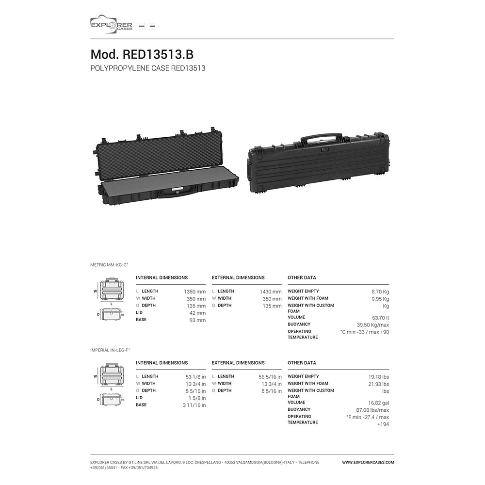 8024482182858 La migliore protezione per il tuo tesoro più prezioso - L'ultimate custodia per armi con una varietà di funzioni nella massima qualità, prodotta da Explorer Cases in Italia. Specifiche: Lunghezza: 1430mm (1350mm interno) Larghezza: 350mm (350mm interno) Profondità: 135mm (135mm interno) Peso: 9,95kg (8,70kg senza rivestimento) Colore: Nero Rivestimento: Pre-Cube Foam Letteralmente indistruttibile Le custodie per armi di Explorer Cases sono dotate di cerniere in metallo resistenti alla corrosione con funzionalità di fermo del coperchio, che fissano il coperchio e lo mantengono in posizione quando è aperto. Puoi stare certo che le tue custodie per armi ti assisteranno per molto tempo. Grazie ai ganci di chiusura, le custodie per armi sono sempre altamente sicure. La guarnizione O-ring le rende anche resistenti all'acqua in grande misura. Ogni custodia per armi è dotata di una valvola manuale di rilascio della pressione dell'aria. Pertanto, puoi stare tranquillo e non avrai problemi a maneggiare e chiudere la custodia. Esattamente come vuoi tu Le custodie sono fornite di tagli interni per supporti o anelli di montaggio interni opzionali, in modo da poter riporre tutto esattamente come è più adatto alle tue esigenze. Ogni singolo bagaglio è dotato di un'etichetta rimovibile impermeabile con cui puoi etichettare la tua attrezzatura o memorizzare i tuoi dati. La custodia può essere trasportata tradizionalmente tramite il grande manico anteriore o tramite cinghie a spalla opzionali, che possono essere facilmente attaccate a qualsiasi modello. La serie Mod Red 13513 può essere utilizzata anche come custodia trolley.Spedizione diretta da fornitore. I tempi di consegna possono variare in base all'origine dei prodotti.