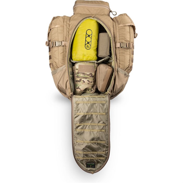Lo zaino Eberlestock Halftrack offre anche 6 litri di capacità per l'acqua, insieme a ripiani di organizzazione e rack in webbing compatibili con MOLLE per attrezzature extra.