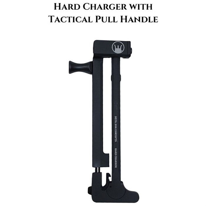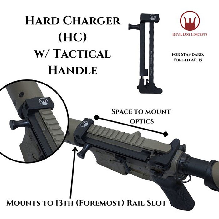 DEVIL DOG CONCEPTS HARD CHARGER SIDE CHARGING HANDLE W/TACTICAL PULL HANDLE FOR AR-15 Hard Charger® with Tactical Handle - for Standard Forged, Mil-Spec AR-15/M4 Rifles No longer do you have to rebuild your upper receiver or buy a new rifle to have the side charging capability!! Turn your rifle into a Side Charger without having to rebuild or modify it. Simply swap out the charging handle and install the Hard Charger. Takes a minute or less and you are up and running! FEATURES Devil Dog Concepts’ Side Charging Handle System = Ergonomically Beneficial Multiple Ways to Charge – Interchangeable from Rifle to Rifle Non Reciprocating Removes Stress on Roll Pin Reduces Torque on Charging Handle Field Strippable – Gross Motor Skills Plenty of Room for Mounting Optics and Sights The Hard Charger® mounts to the 13th Picatinny Rail and is designed to work on Standard, Forged, Mil-Spec Type Upper Receivers & Billet Rifles. Not designed for Billet Rifles including Aero M4E1 This design allows optic and sight mounting to the rear of the Hard Charger. This is the original Hard Charger, Side Charging Handle System. Hard Charger (HC), AR-15 Mil-spec, Forged Uppers only: mounts to the Foremost (13th) Picatinny rail slot replacing the existing charging handle. SPECS For Standard, Forged Flat Top AR-15s Made from 7075 Aluminum Anodized Black, and Steel Weighs 6oz 5 year manufacturer warranty